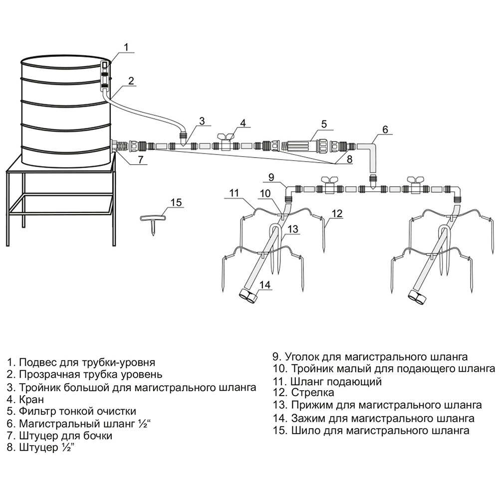 В комплект для капельного полива ТМ Жук входит штуцер присоединения к ёмкости, которого у других производителей нет.