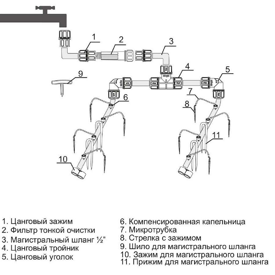 Зажимы магистрального шланга, входящие в комплект, дают возможность устанавливать капельный полив Жук сразу на несколько грядок