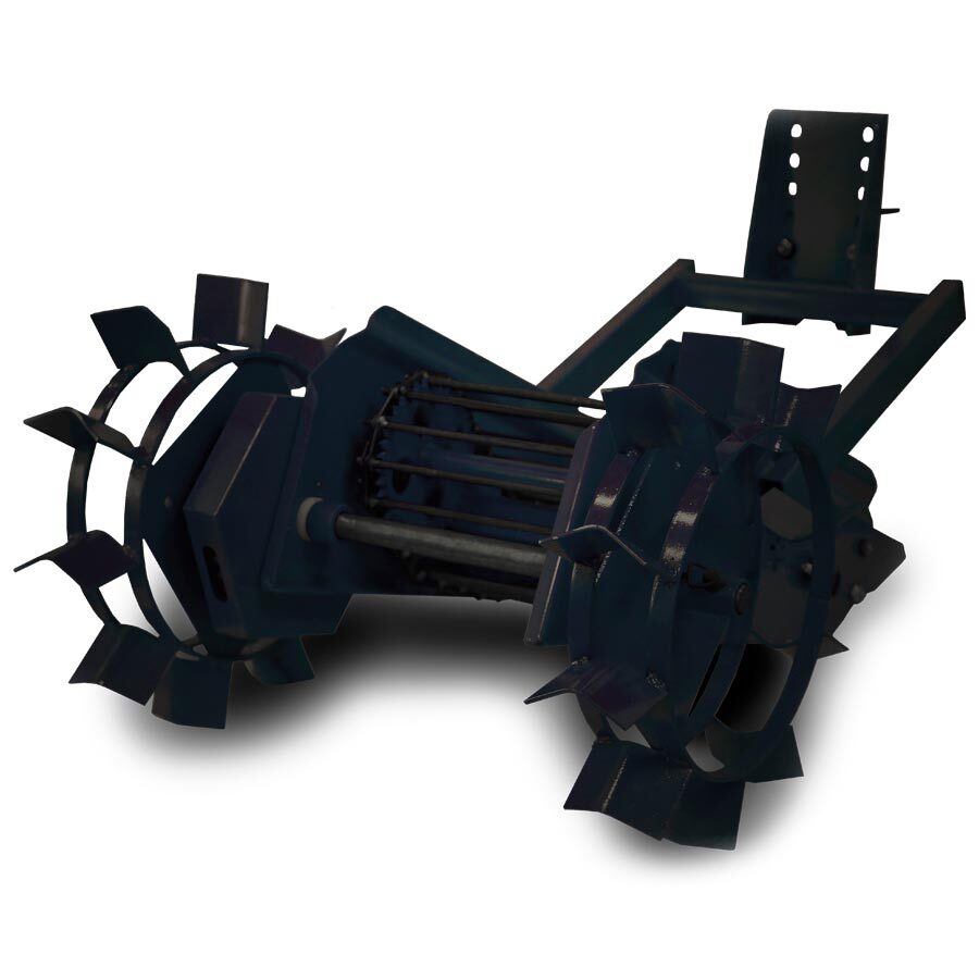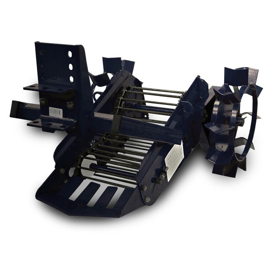 Картофелекопалка состоит из рыхлителя, корпуса, транспортера и грунтозацепов на колесной оси. Металлические лопасти обеспечивают надежное сцепление с почвой. Ширина захвата — 30 см, глубина обработки почвы — 20 см.