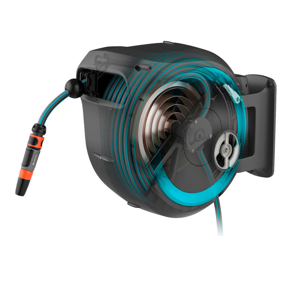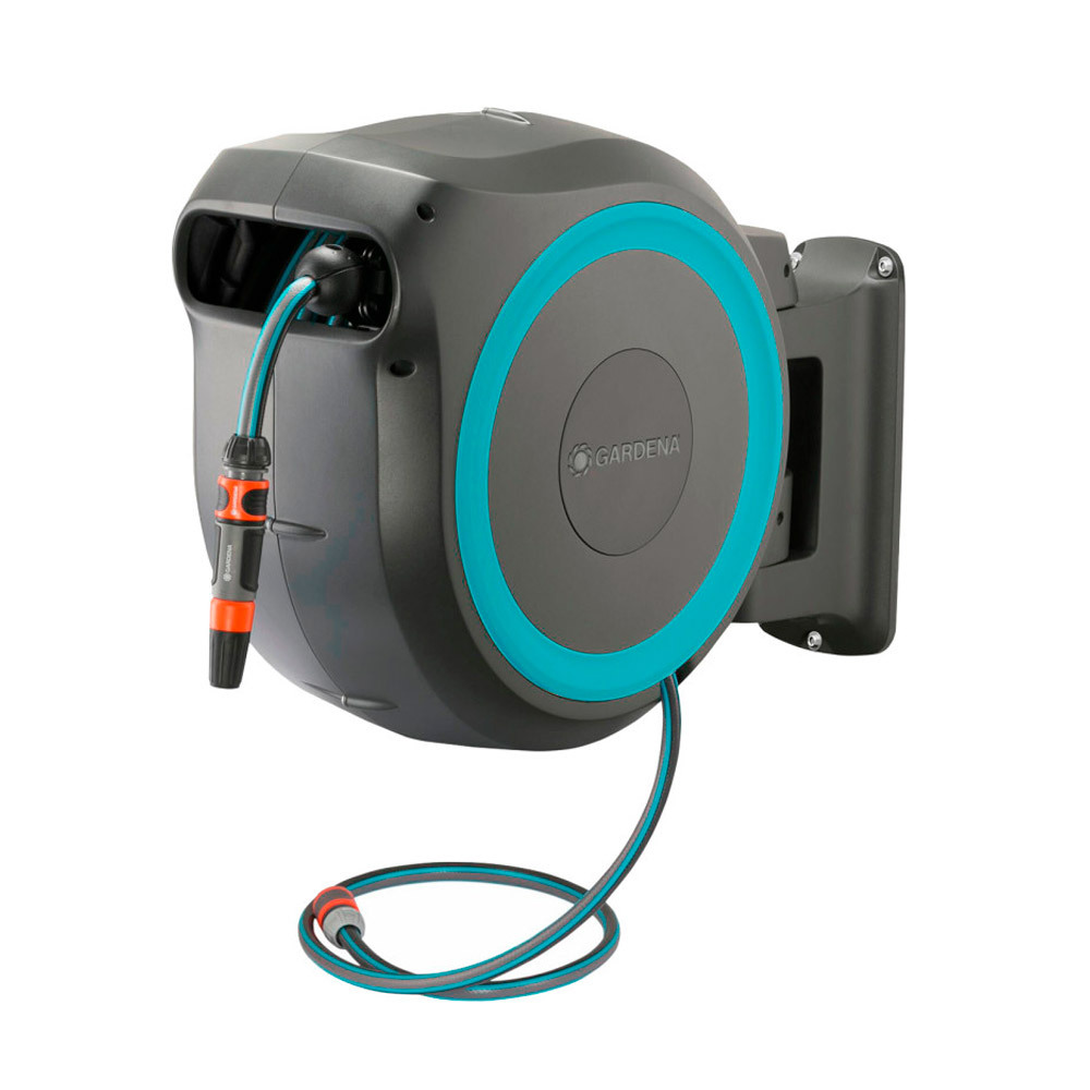 Вы прикрепляете катушку со шлангом к стене вашего дома и соединяете его с краном соединительным шлангом. Благодаря 35-метровому шлангу и поворотной катушке на 180° полив ваших растений превращается в удовольствие, а не в рутину. Катушка следует за вашим направлением движения и предотвращает перегибы или спутывание шланга. После того как вы вытянули шланг до нужной для полива длины, короткие фиксирующие точки автоматически фиксируют шланг, как только вы останавливаетесь. Слегка потянув за конец шланга, вы ослабляете фиксацию, и встроенная стальная пружина полностью автоматически, надежно и равномерно сматывает садовый шланг. Благодаря инновационной технологии RollControl сматывание шланга происходит безопасно и надежно. Встроенная направляющая шланга гарантирует, что шланг смотан аккуратно и равномерно, без перегибов.