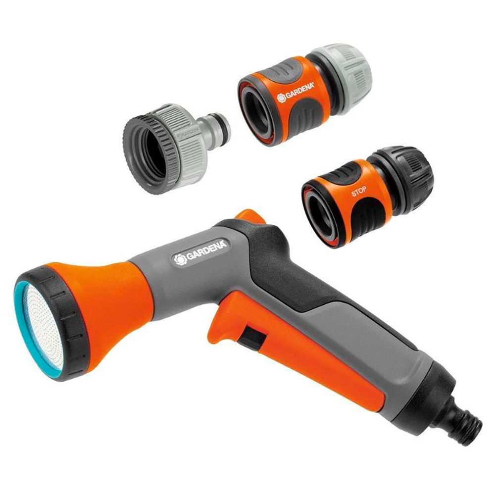 Комплект для полива Gardena для полива. Пистолет-распылитель снабжен элементами из мягкого пластика, благодаря чему инструмент удобно лежит в руке. Фиксатор позволяет осуществлять длительный полив без необходимости постоянно нажимать на курок.