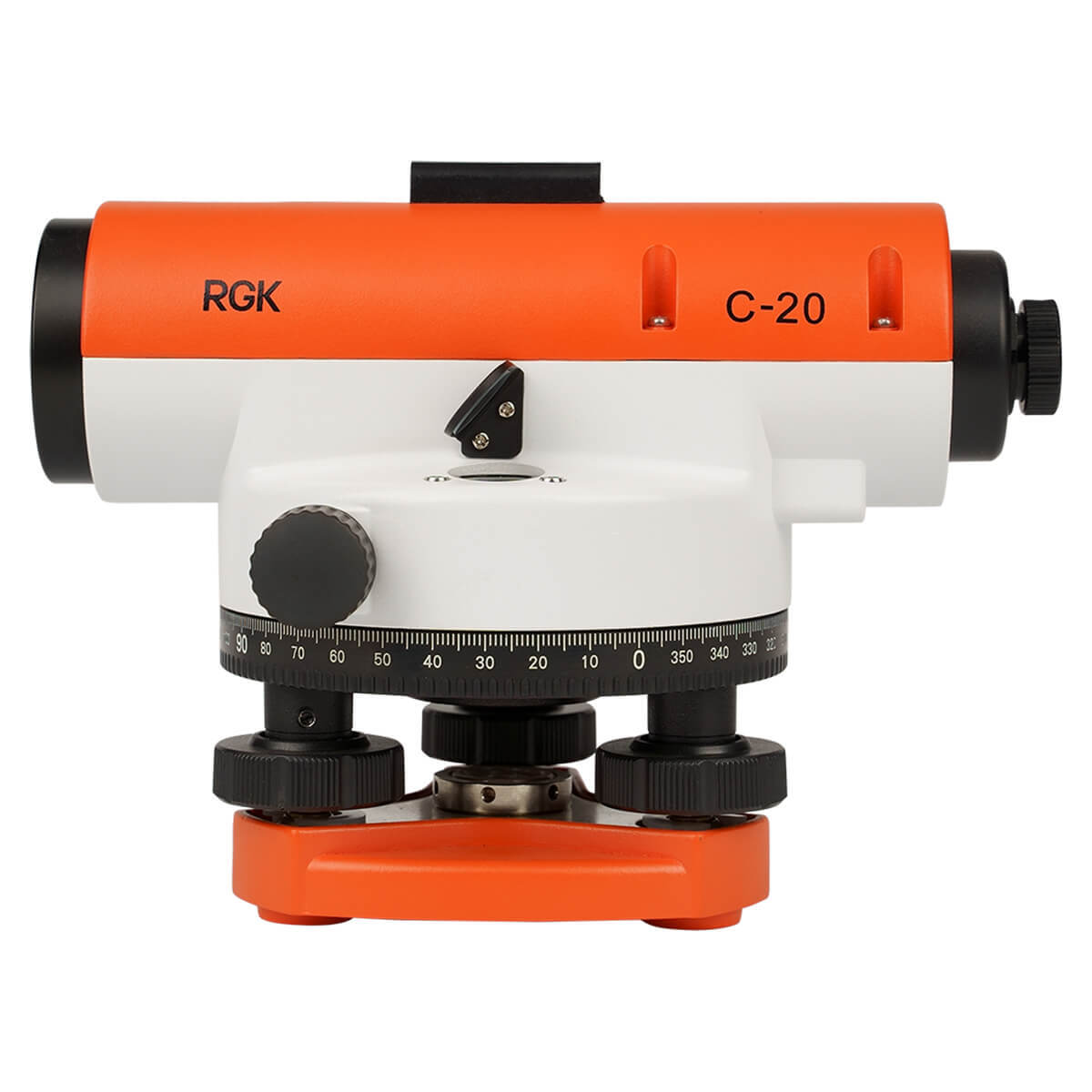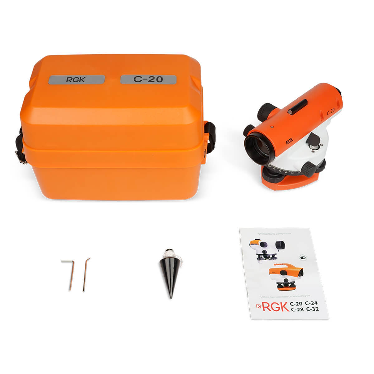 Комплект Оптический нивелир RGK C-20 Штатив S6-N Рейка AMO S5 Нитяной отвес Юстировочный набор Руководство по эксплуатации Транспортировочный кейс Оптический нивелир RGK C-20 – идеально подходящий для производства нивелирования в строительстве и геодезии. Прочный и надежный корпус прибора обеспечивает идеальную защиту от воздействия внешних факторов, благодаря чему этот прибор способен работать в самых различных погодных условиях. Точность, с которой нивелир способен определять превышения, не превышает 2,0 миллиметра на каждый километр двойного хода. Компенсатор с воздушным демпфером контролирует состояние оси прибора. 20-х кратное увеличение зрительной трубы и качественная оптика обеспечивает контрастное и четкое изображение в самых различных условиях освещенности. Легкий вес, компактные размеры и удобные наводящие винты обеспечивают легкость и комфорт работы с прибором в течение всего рабочего дня.