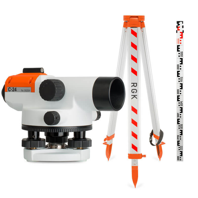 Комплект Оптический нивелир RGK C-24 Штатив RGK S6-N Рейка AMO S4 Нитяной отвес Юстировочный набор (шестигранный ключ Шпилька) Руководство по эксплуатации Транспортировочный кейс Оптический нивелир RGK C-24 - идеально подходящий для нивелирных работ как для строительства, так и для геодезии. Прочный и надежный корпус прибора обеспечивает идеальную защиту от воздействия внешних факторов, благодаря чему этот прибор способен работать в самых различных погодных условиях. Точность, с которой нивелир способен определять превышения, не превышает 2,0 миллиметра на каждый километр двойного хода. Компенсатор маятниковый с магнитным демпфером самостоятельно состояние оси прибора, при необходимости корректируя ее. 24-х кратное увеличение зрительной трубы и качественная оптика обеспечивает четкое изображение в различных условиях освещенности. Легкий вес, компактные размеры и удобные наводящие винты обеспечивают легкость и комфорт работы с прибором в течение всего рабочего дня.