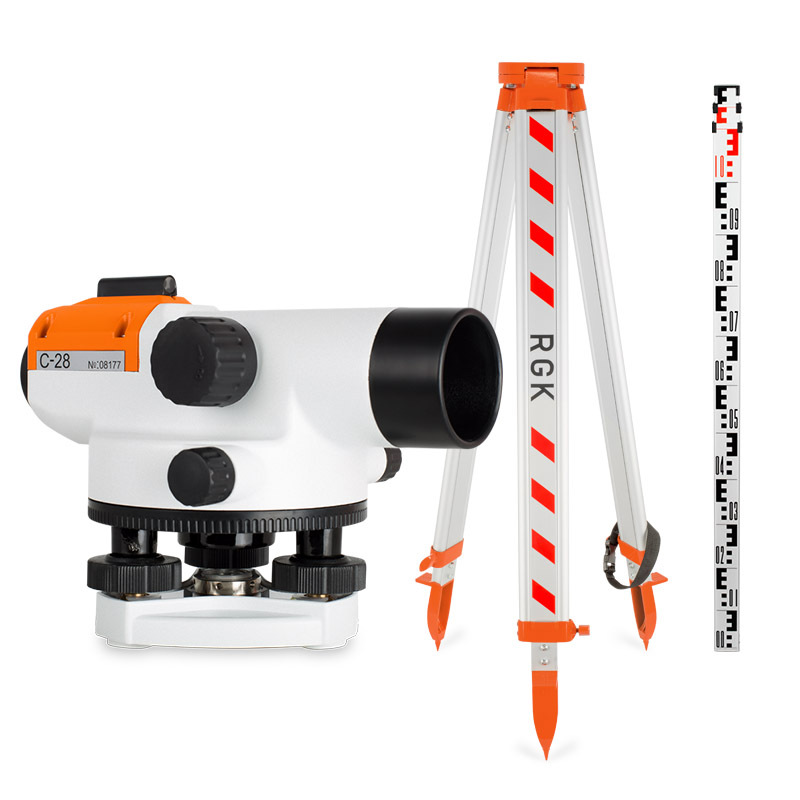 Комплект Оптический нивелир RGK C-28 Штатив S6-N Рейка Нитяной отвес Юстировочный набор Руководство по эксплуатации Транспортировочный кейс Оптический нивелир RGK C-28 – это превосходный инструмент, идеально подходящий для производства нивелирования в самых различных отраслях строительства и геодезии. Прочный и надежный корпус прибора обеспечивает идеальную защиту от воздействия внешних факторов, благодаря чему этот прибор способен работать в самых различных погодных условиях. Точность, с которой нивелир способен определять превышения, не превышает 1.5 миллиметра на каждый километр двойного хода. Автоматический компенсатор маятниковый с магнитным демпфером самостоятельно контролирует состояние оси прибора, при необходимости корректируя ее. 28-х кратное увеличение зрительной трубы и качественная просветленная оптика обеспечивает контрастное и четкое изображение в самых различных условиях освещенности. Легкий вес, компактные размеры и удобные наводящие винты обеспечивают легкость и комфорт работы с прибором в течение всего рабочего дня.