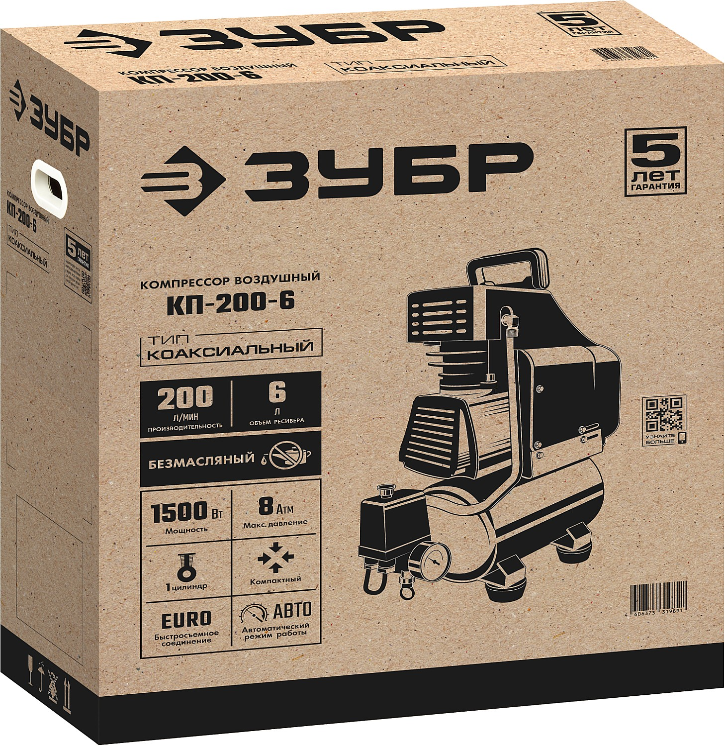 Безмасляный воздушный компрессор ЗУБР КП-200-6 (200 л/мин, 1500 Вт) обеспечивает чистый сжатый воздух без масляных примесей для покраски, подкачки шин и очистки техники. Прочный компактный корпус и ресурс до 1000 часов делают его надежным помощником в домашнем ремонте, на даче и в небольшой мастерской. Мобильный, долговечный и универсальный — идеален для бытовых задач, где важны чистота воздуха и простота эксплуатации.
