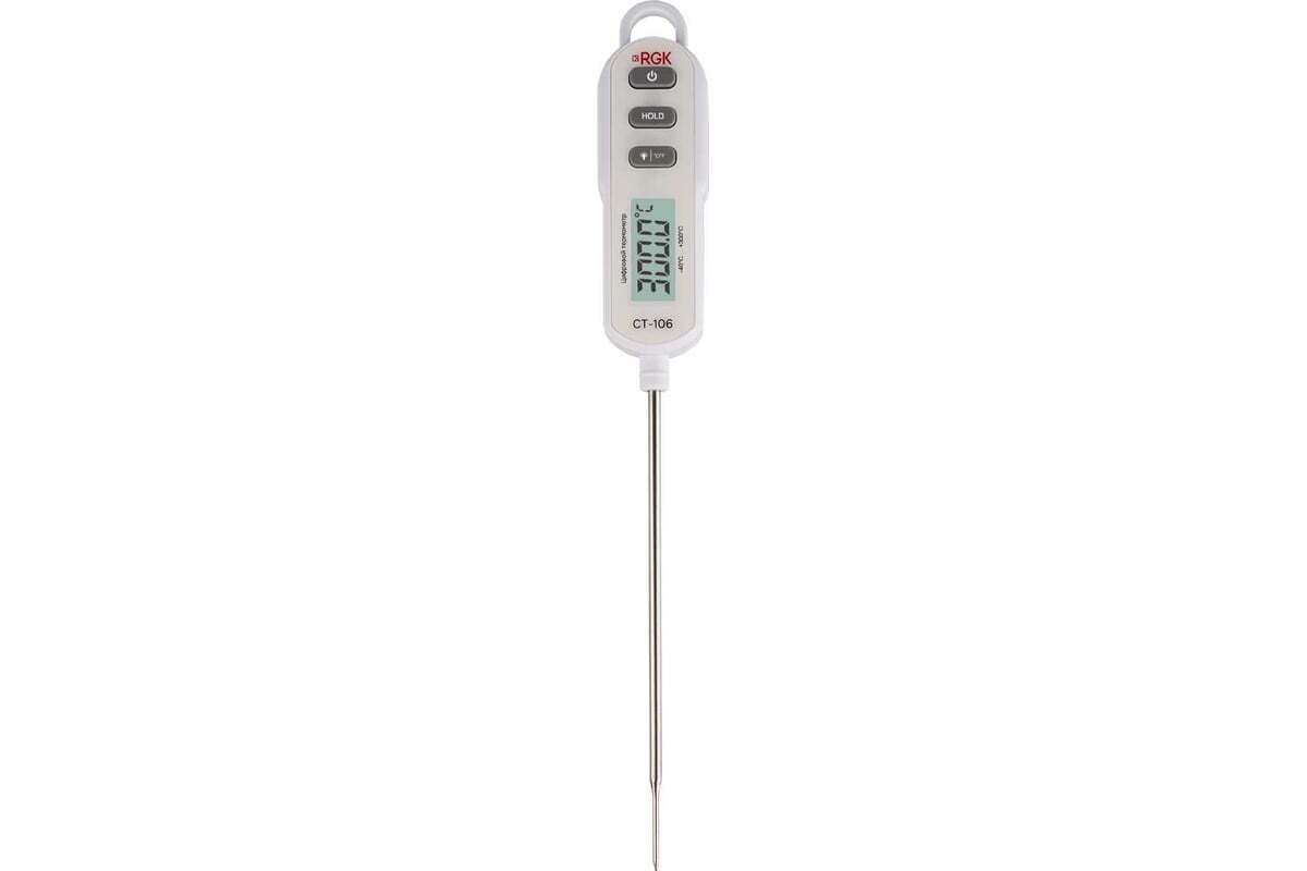 Термометр цифровой RGK CT-106 служит для контактного измерения температурных параметров целевых объектов в пределах от -40 до + 300°C, обеспечивая точность ±0,5°С в диапазоне от –20 до +150°С. Инструмент оснащен батарейным питанием и несъемным заостренным и утонченным в передней части погружным зондом, оболочка которого изготовлена из пищевой нержавеющей стали, позволяющим оперативно определять температуру внутри жидких, вязких, сыпучих веществ и материалов, продуктов питания и т.п. Изделие характеризуется высоким быстродействием за счет малого времени отклика и подходит для бытового и профессионального применения.