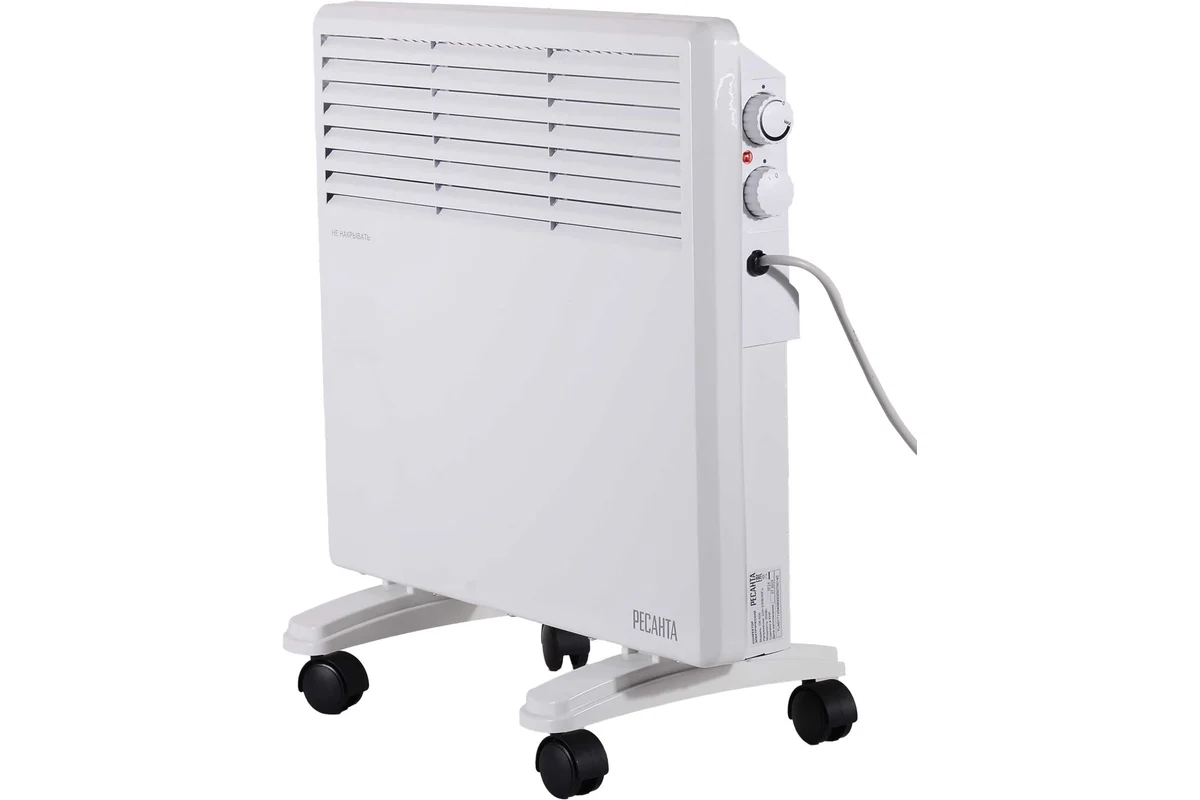 Модель конвектора Ресанта ОК-500. Её потребляемая мощность составляет 500 Вт. Используемый нагревательный элемент – монолитный Х-образный, отличается большой площадью теплоотдачи. Корпус конвектора белого цвета, имеет жалюзи с наклоном. Все эти конструктивные особенности обеспечивают высокий КПД прибора с возможностью выступать в качестве основного источника отопления для комнаты площадью 10 м² или дополнительного для больших по объёму помещений.