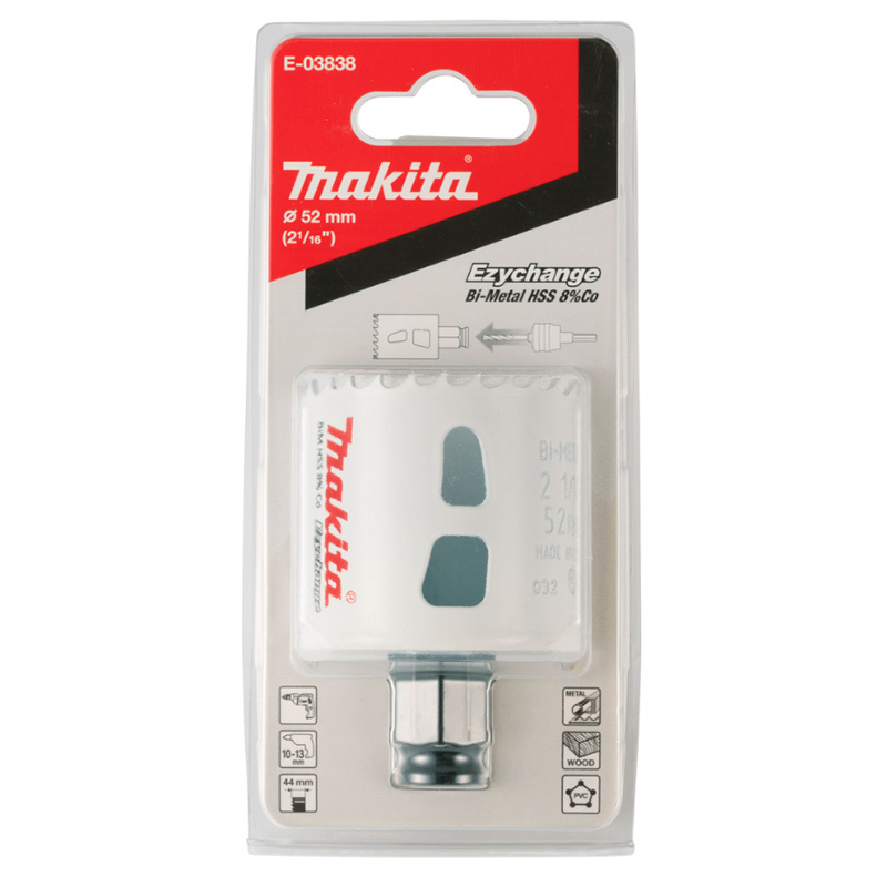 Коронка Makita Ezychange 52мм биметаллическая (E-03838) с системой быстрой замены. Благодаря дополнительным зубьям из быстрорежущей стали 4мм глубина коронки составляет 44мм. Оснащена прогрессивным шагом зубьев и отверстиями для ускоренной эвакуации стружки. Используется в сочетании с адаптером и центрирующим сверлом.