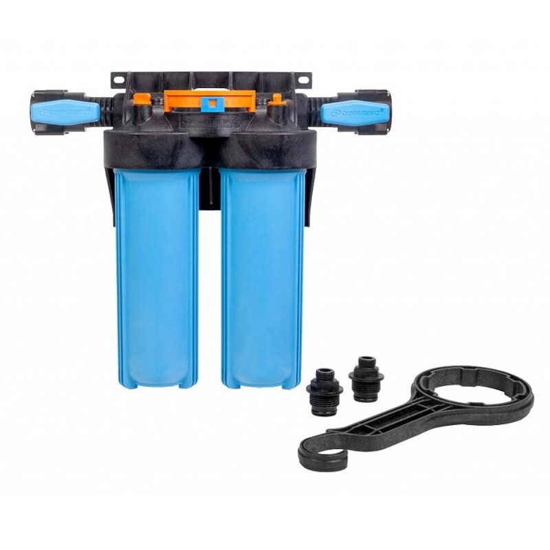 Корпус для картриджного фильтра Джилекс 1 М Т2 предназначен для размещения в нём картриджей или фильтрующей засыпки для дальнейшей очистки холодной воды в бытовых условиях. Изготавливается из армлена, прочного материала устойчивого к циклическим нагрузкам и не пропускающего ультрафиолетовые лучи сквозь корпус. Типоразмер колб - Slim Line 10”. Использование двухступенчатых корпусов фильтра рекомендуется в случаях, где необходимы картриджи разных фильтрующих свойств. Это существенно облегчит монтаж и последующее обслуживание системы по сравнению с одинарными корпусами. Поворот коллектора на 180° позволяет установить корпус фильтра в магистраль, с направлением движения воды, как слева направо, так и справа налево. Компактное расположение парных корпусов. Магистральную трубу можно разместить вплотную к стене. Кронштейн является одним целым с крышкой корпуса фильтра. В корпусе предусмотрены специальные технологические отверстия (пробки) для сброса избыточного давления и слива остаточной воды. В комплект поставки входит ключ, с помощью которого можно отвернуть колбу от крышки, а также уплотнительная вставка белого цвета для картриджных элементов без сердечника. На концах коллектора встроены шаровые краны.
