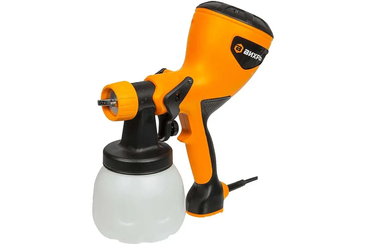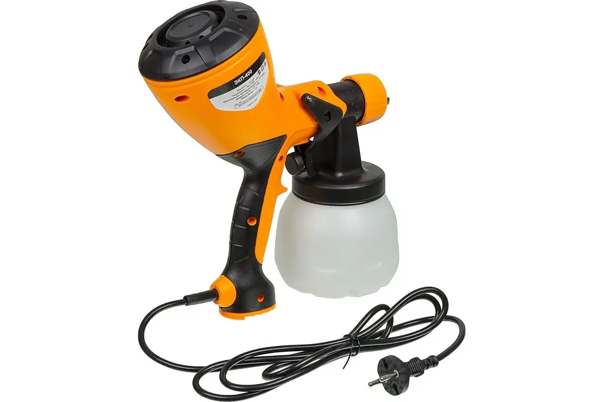 Конструктивно Вихрь ЭКП-400 состоит из горизонтально расположенного двигателя, встроенной системы распыления HVLP, бака для ЛКМ с нижним расположением и рукояти с противоскользящим покрытием. Мощности электрического краскопульта в 400 ВТ достаточно, чтобы обеспечить производительность до 0,7 л/мин. Бачок объемом 0,8 л требует частой заправки, но облегченная конструкция в сочетании с удобной прорезиненной рукоятью не утомляет руку во время работы.