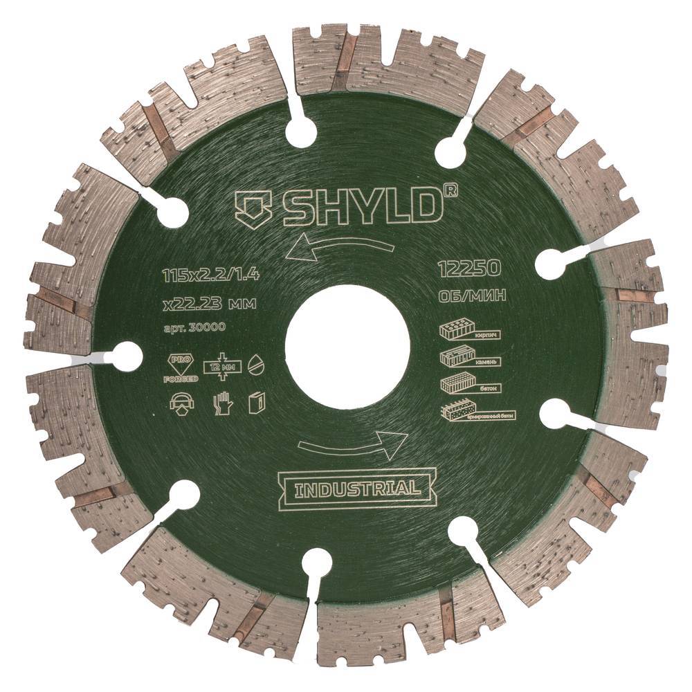 Круг алмазный универсальный SHYLD 115х2.2х22.2мм (30000) предназначен для Предназначены для резания бетона, кирпича, камня ручным электроинструментом таким как МШУ. Сухой рез. Вырезанное лазером полотно диска из легированной стали гарантирует точность работы и исключает вибрацию диска на инструменте. Автоматизированный процесс спекания PRO FORGED обеспечивает высокое качество оснастки с сегментами разных видов, позволяя добиться высокой производительности и повысить сроки эффективной эксплуатации до 200% по сравнению с обычными дисками. Процесс симметричного нанесения алмазов DIAMOND NET в режущем сегменте повышает производительность и увеличивает срок службы диска вследствие равномерного распределения нагрузки между зернами. Технология SLIDE PRO минимизирует боковое трение между материалом и сегментом для более высокой скорости реза. Совокупность материала и современных технологических решений обеспечивает точность реза даже при интенсивном использовании, сохраняя свойства после множества рабочих циклов.