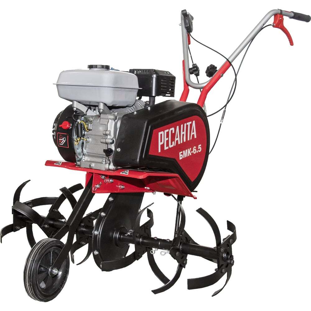 Модельмотокультиватора Ресанта БМК-6.5подойдет для владельцев приусадебных и дачных участков, и небольших фермерских хозяйств. Мощность 4-х тактного одноцилиндрового бензинового двигателя составляет 6.5 л.с. Тип охлаждения силового агрегата – воздушный. Повышенная мощность и наличие специальных закалённых фрез позволяет с лёгкостью обрабатывать практически любые почвы, включая тяжёлые. Ширина обработки составляет 85 см. Диаметр фрез – 30 см. Глубина обработки регулируется сошником. Ресанта БМК-6.5 относится к категории манёвренных агрегатов. Этому способствует наличие реверса и специального транспортировочного колеса, которые значительно упрощают работы с применением культиватора и позволяют обрабатывать участки со сложным рельефом. Мотокультиватор БМК-6.5 имеет регулируемый по высоте руль, что позволяет настроить инструмент под любой рост. Сравнительно небольшой вес мотокультиватора, который составляет 50 кг, упрощает его транспортировку. Хромированная поршневая группа и надёжный цепной редуктор обеспечивают стабильную работу и повышенный рабочий ресурс. Гарантия на двигатель составляет 3 года.