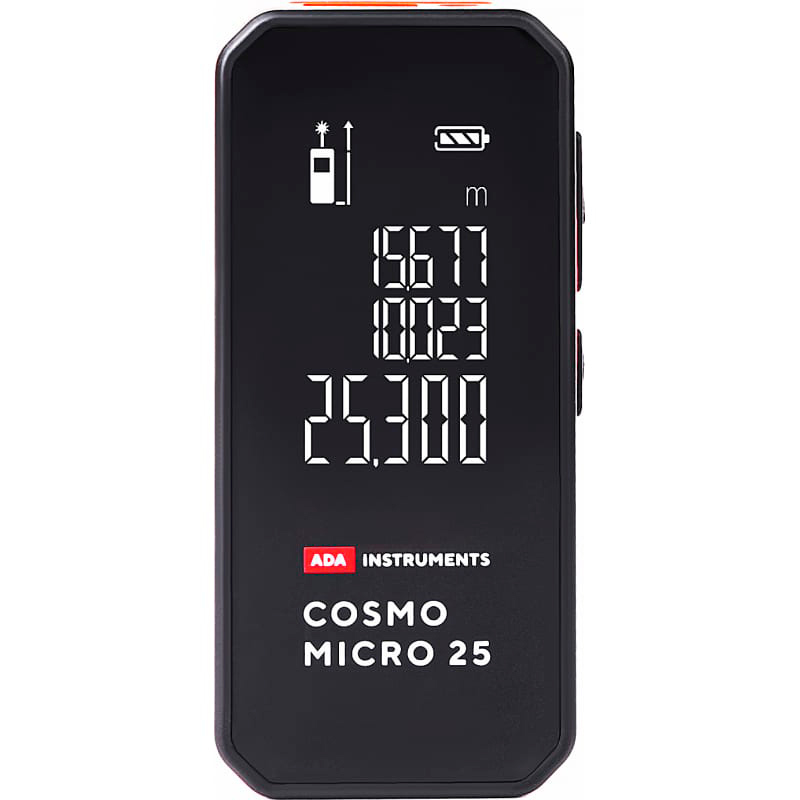 Лазерный дальномер ADA Cosmo MICRO 25 предназначен для измерений дистанций до 25 метров. Способен передавать данные измерений с помощью беспроводного канала связи ВТ при использовании мобильного приложения ADA PHOTO PLAN. Все измерения производятся при помощи всего двух кнопок. Первая – измерение, она же включение, вторая кнопка для выключения. 3-строчный контрастный дисплей с постоянной подсветкой удобен при работе в любое время суток при любом освещении.