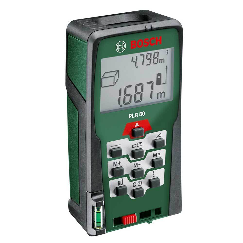 Лазерная рулетка Bosch PLR 50 предназначена для измерения расстояния до 50 метров. Дополнительные функции дальномера: возможность вычислять площадь и объем, а также складывать и вычитать результаты измерений. При бездействии в течение 5 минут прибор автоматически отключается.