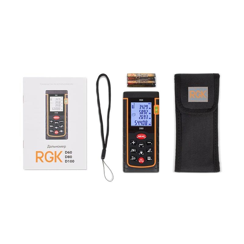 Лазерный дальномер RGK D80 — универсальный измеритель расстояния для строителей, архитекторов, инженеров, дизайнеров и других специалистов, работающих с точными планами помещений, зданий и придомных районов. Дальность измерений — 80 метров. Дальномер RGK D80 будет полезен и в квартирах, и в крупноразмерных зданиях — торговых центрах, заводских комплексах и офисах open-space. Точность измерения — ±3 мм на всём диапазоне измерений и даже при ярком солнечном свете. Главные преимущества RGK D80 Функционал Откидная скоба Эргономичный корпус Функции прибора позволяют выполнять полный спектр измерений на объекте и включают в себя: Непрерывные измерения. Расчёт площади и объёма. Косвенные измерения по Пифагору. Арифметические действия с длиной, площадью и объёмом — сложение, вычитание. Измерение заданного расстояния. Таймер отложенного измерения. Минимальное и максимальное значения. Функция памяти — до 100 измерений. Такой набор функций обеспечит эффективное решение различных задач, например: Получить недоступное для прямого измерения расстояние. Быстро рассчитать расход отделочных и строительных материалов. Отсчитать необходимое расстояние от исходной точки. Разметить отрезки равной длины. Получить точные значения при измерении на весу и в углы. Откидная скоба RGK D80 обеспечит точное измерение диагонали из угла. Точка отсчёта может быть установлена на переднюю и заднюю грани прибора, а также на откидную скобу и винт для измерений со штатива. Корпус выполнен из матового немаркого пластика. Дальномер RGK D80 достаточно массивен, чтобы комфортно лежать в руке, и не выскальзывает благодаря эргономичной форме и ребристой поверхности. Встроенный пузырьковый уровень обеспечивает выравнивание в горизонт. Дисплей отображает подробную информацию об измерениях и режиме работы прибора. Четыре строки выводят текущее значение и три предыдущих, что особенно полезно при выполнении расчётов площади, объёма и теоремы Пифагора. Также лазерный дальномер отображает на экране единицу измерения, уровень заряда батареи, параметры заданных отрезков и точку отсчёта. Управление осуществляется с помощью десяти кнопок с наглядными пиктограммами. Кнопки хорошо прощупываются и расположены на большом расстоянии друг от друга, что позволяет легко использовать дальномер RGK D80 в рабочих перчатках. Питание осуществляется от 2 батарей ААА и рассчитано на 8000 измерений.