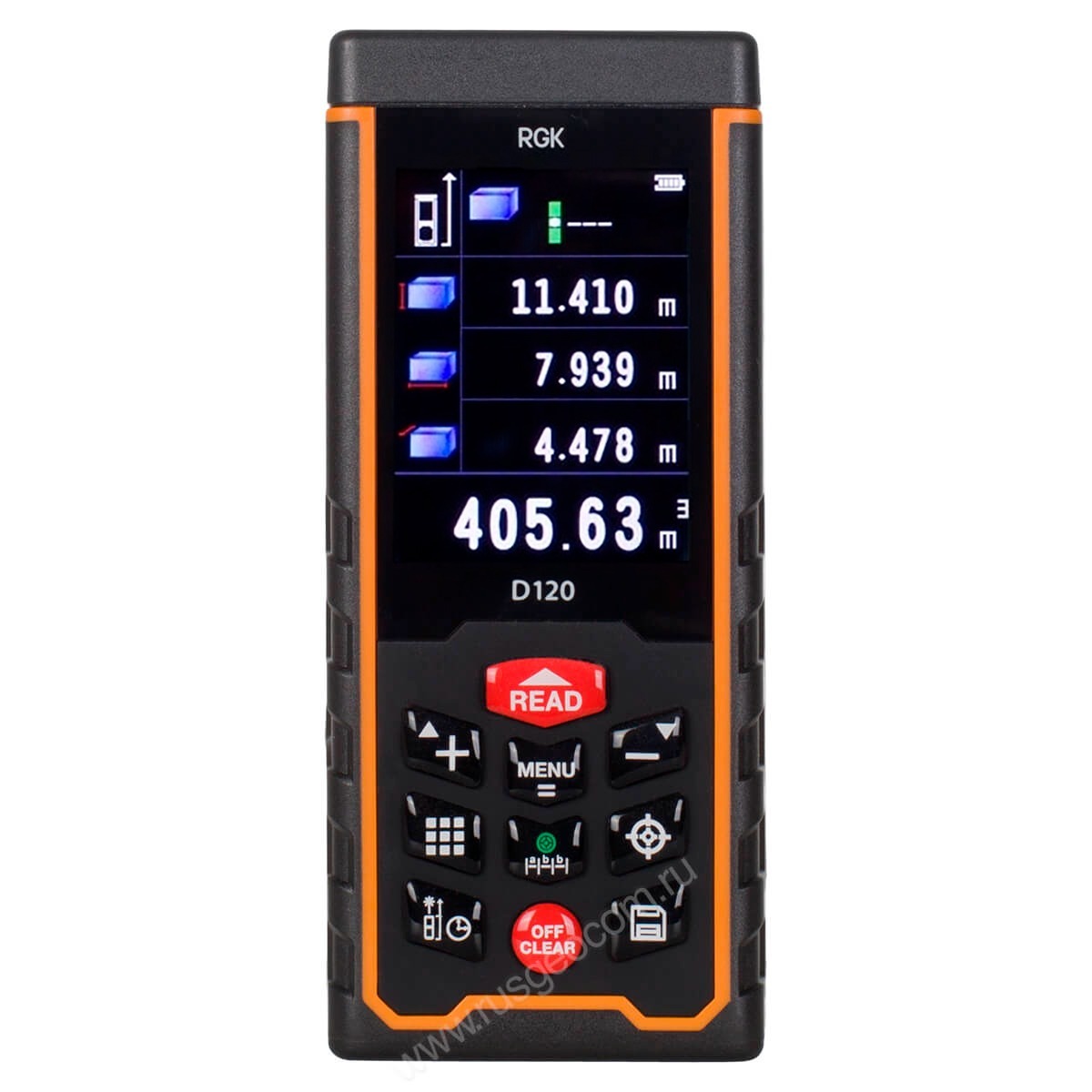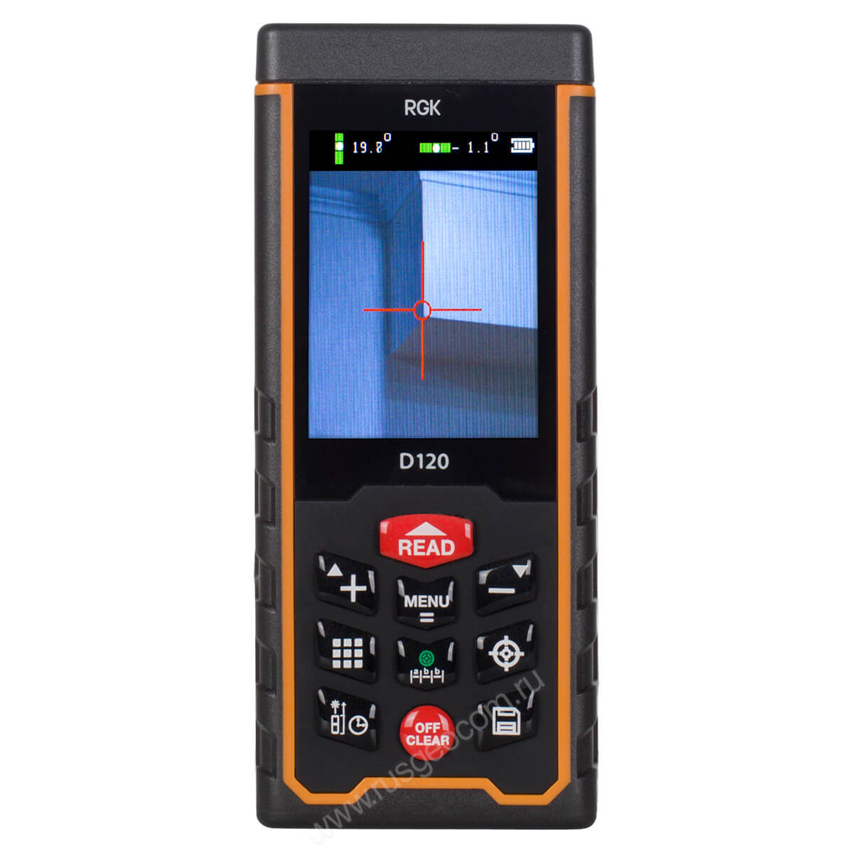 Лазерный дальномер RGK D120 (с поверкой) предназначен для измерений больших расстояний — до 120 метров, как в помещении, так и на улице. Качество и удобство измерений не зависит от освещения и может выполняться даже в солнечную погоду. Основные преимущества RGK D120 (с поверкой) Увеличенное расстояние измерений — лазерный дальномер с видоискателем RGK D120 (с поверкой) измеряет дистанцию до 120 метров с точностью ±3 мм. Цифровой видоискатель — позволит проводить измерения на предельных дистанциях до 120 метров как в помещениях, так и на улице, вне зависимости от освещения. Даже солнечная погода не помешает точно навести дальномер на цель. Micro-USB — служит для загрузки сохранённых данных на ПК для последующей обработки в программе LDM Studio, поставляемой в комплекте с RGK D120 (с поверкой). С помощью этой программы вы сможете мгновенно распечатать результаты измерений или выгрузить их в таблицу Excel. В таблице содержится информация обо всех замерах и результатах вычислений, а также о промежуточных значениях при подсчёте площадей и объёмов. Уровень и инклинометр — обеспечивают точное выведение измерений в горизонт и возможность измерения угла — в градусах, или уклона — в процентах. Также позволяет выровнять горизонтальные поверхности с помощью цифрового кругового уровня. Программное меню — позволяет настроить параметры работы дальномера с видоискателем RGK D120 (с поверкой), включая длительность работы подсветки, задержку таймера и т.п. Функционал Являясь флагманом линейки дальномеров этого бренда, лазерная рулетка с видоискателем RGK D120 (с поверкой) оснащена всеми стандартными функциями: Арифметические вычисления — расчёт площади, объёма, сложение и вычитание измерений. Расчёт по теореме Пифагора — вычисление недоступных расстояний, например, высоты дома или участка стены. Измерение заданного расстояния — используется для откладывания отрезков определённой длины от стен, потолка, пола и предметов интерьера, а также разметки линии на равные части. Измерение с задержкой — обеспечит точность измерений и исключит возможность сбить наведение дальномера RGK D120 (с поверкой) при нажатии кнопки. Режим непрерывных измерений обеспечит точное приведение измерений в горизонт, а также облегчит измерение расстояний до внутренних углов.