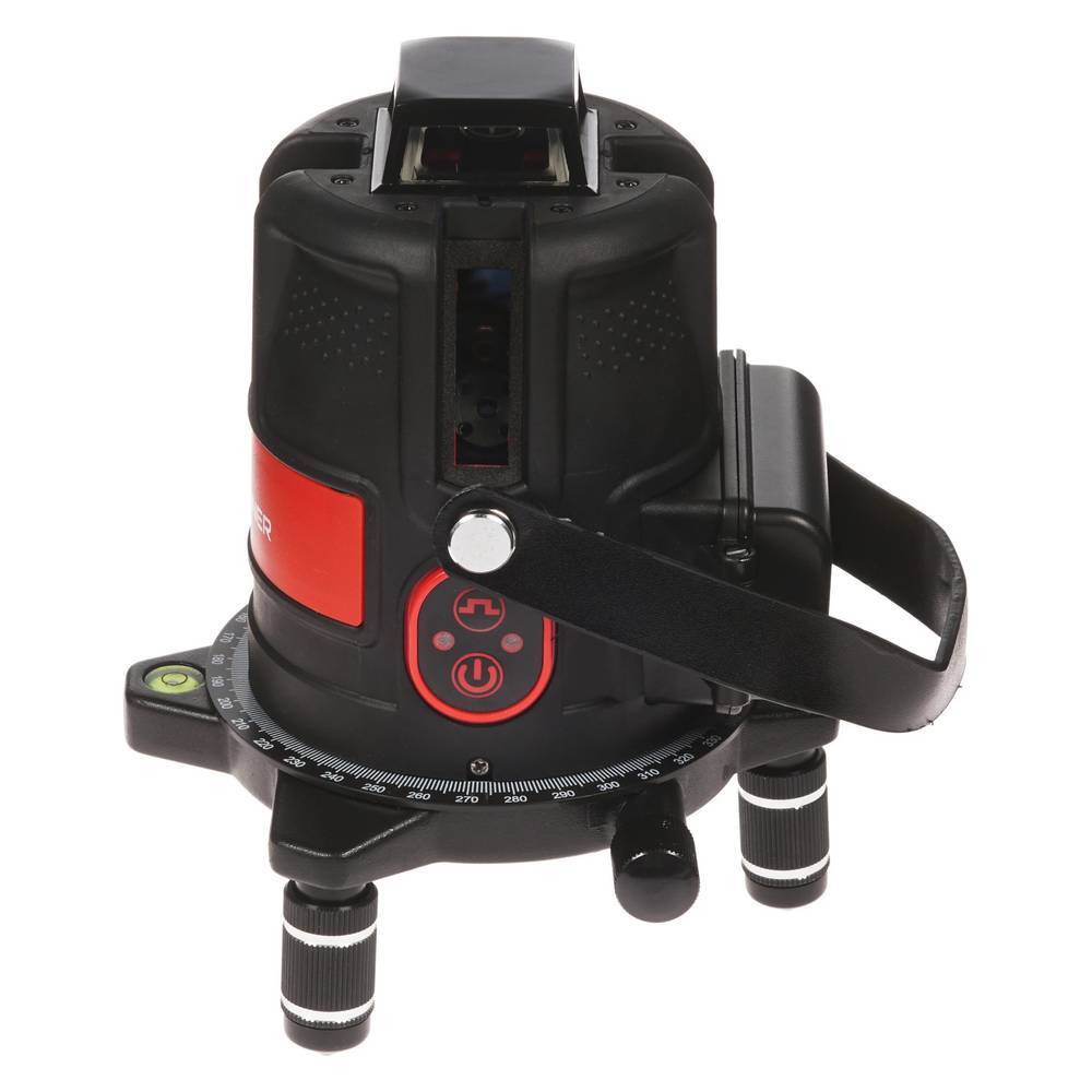 В нижней части корпуса расположено свободно вращающееся градуированное кольцо. Для вращения корпуса и подгонки лазерных линий можно использовать специальный винт. Благодаря этому вы сможете быстро выставить метки на нужных объектах: на полу, стенах или потолке. Кроме того, форм-фактор трипода позволяет в удобной форме расположить лазерный нивелир на объекте.