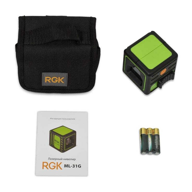 Лазерный уровень RGK ML-31G – компактный прибор бытового класса. Основная сфера его применения – квартирный ремонт. Ключевой особенностью данного нивелира является луч зеленого цвета, что обеспечивает хорошую его видимость даже при ярком освещении. Особенности лазерного уровня RGK ML-31G Точность построения ±2 мм на 10 метров. Видимый диапазон работы лазера – 20 метров. Автоматическое самовыравнивание в диапазоне ± 3°. Режим работы с наклонными плоскостями. Лазерная система нивелира RGK ML-31G проецирует одну горизонтальную и одну вертикальную плоскость с углом развертки 110°. Благодаря использованию лазера зеленого цвета, проекцию хорошо видно даже при ярком освещении. Это позволяет использовать прибор на улице на малых дистанциях, например, при строительстве дачи. Маятниковый компенсатор лазерного уровня RGK ML-31G автоматически выравниваниет лазерную плоскость в диапазоне ±3°. При большем отклонении от горизонта лучи начнут мигать, что исключит возможность ошибки при разметке. При необходимости компенсатор можно отключить, тогда вы сможете использовать нивелир для построения наклонных плоскостей. Такая функция окажется полезной, например, при разметке скатов крыши или укладке плитки по диагонали. Управление прибором осуществляется всего двумя кнопками: первая отвечает за работу с компенсатором и включает лазеры, вторая – для работы с наклонными плоскостями. Корпус лазерного уровня RGK ML-31G изготовлен из прочного АБС пластика и дополнительно прорезинен для лучшей защиты от ударов и других механических воздействий. Класс пыле-влагозащиты IP54 позволяет работать на запыленной стройплощадке и в помещениях с повышенной влажностью, не опасаясь за работоспособность нивелира. Компактные размеры и сравнительно небольшой вес RGK ML-31G не только упрощают размещение прибора в замкнутом пространстве, но и позволяют использовать даже самые простые и слабые кронштейны. Для установки на них прибора предусмотрено крепления диаметром 1/4". Чехол, который входит в стандартную комплектацию, упрощает переноску и хранение лазерного уровня RGK ML-31G. Благодаря специальной петельке его можно повесить на поясе или закрепить в ящике с инструментами. Питания прибора обеспечивается тремя стандартными батарейками типа ААА на 1.5 В. Одного заряда достаточно в среднем для 4 часов непрерывной работы.