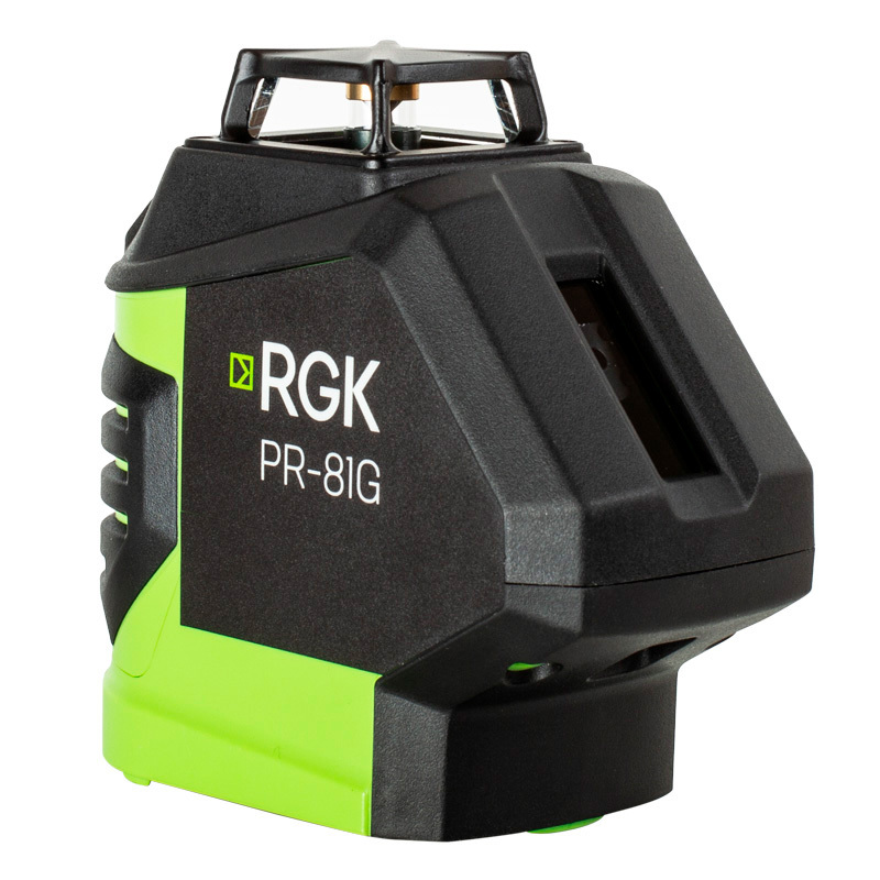 Лазерный уровень RGK PR-81G строит вертикальные и горизонтальные плоскости. Прибор может использоваться в помещении и на улице, так как работает в импульсном режиме для использования с приемником. Используемый в приборе лазер зеленого цвета с длиной волны 515 нм обеспечивает лучшую видимость при ярком освещении, в отличие от лазера красного цвета. Лазерный уровень оснащен функцией работы с приемником излучения, что позволяет увеличить дальность работы до 80 метров. Режимы отображения линий переключаются нажатием соответствующей кнопки, что обеспечивает проекцию нужных в данный момент плоскостей для упрощения работы и экономии заряда батарей. Прибор оборудован маятниковым компенсатором, который автоматически выравнивает лазерный луч в диапазоне ±4°. При наклоне устройства на угол, больший чем 4°, луч начнет мигать. Блокировка компенсатора поможет при строительстве лестниц и укладке плитки под углом. Питание обеспечивается четырьмя батареями стандарта АА напряжением 1,5 В. Устройство имеет корпус с защитой IP54.