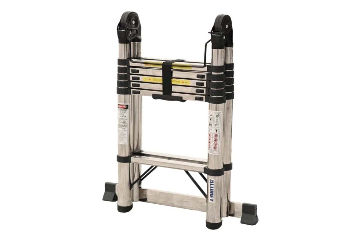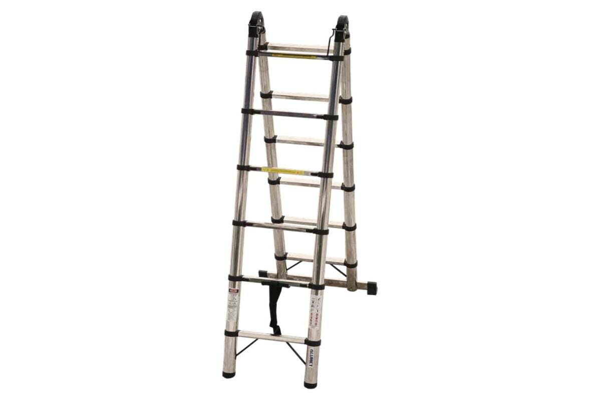 Лестница телескопическая двухсторонняя с шарниром представляет собой две лестницы, выдвигающиеся телескопическим методом на определенную высоту и соединенные стальными шарнирами. Каждая ступень (кроме первой) имеет с двух сторон фиксаторы. Шаг регулировки по высоте - 300 мм.