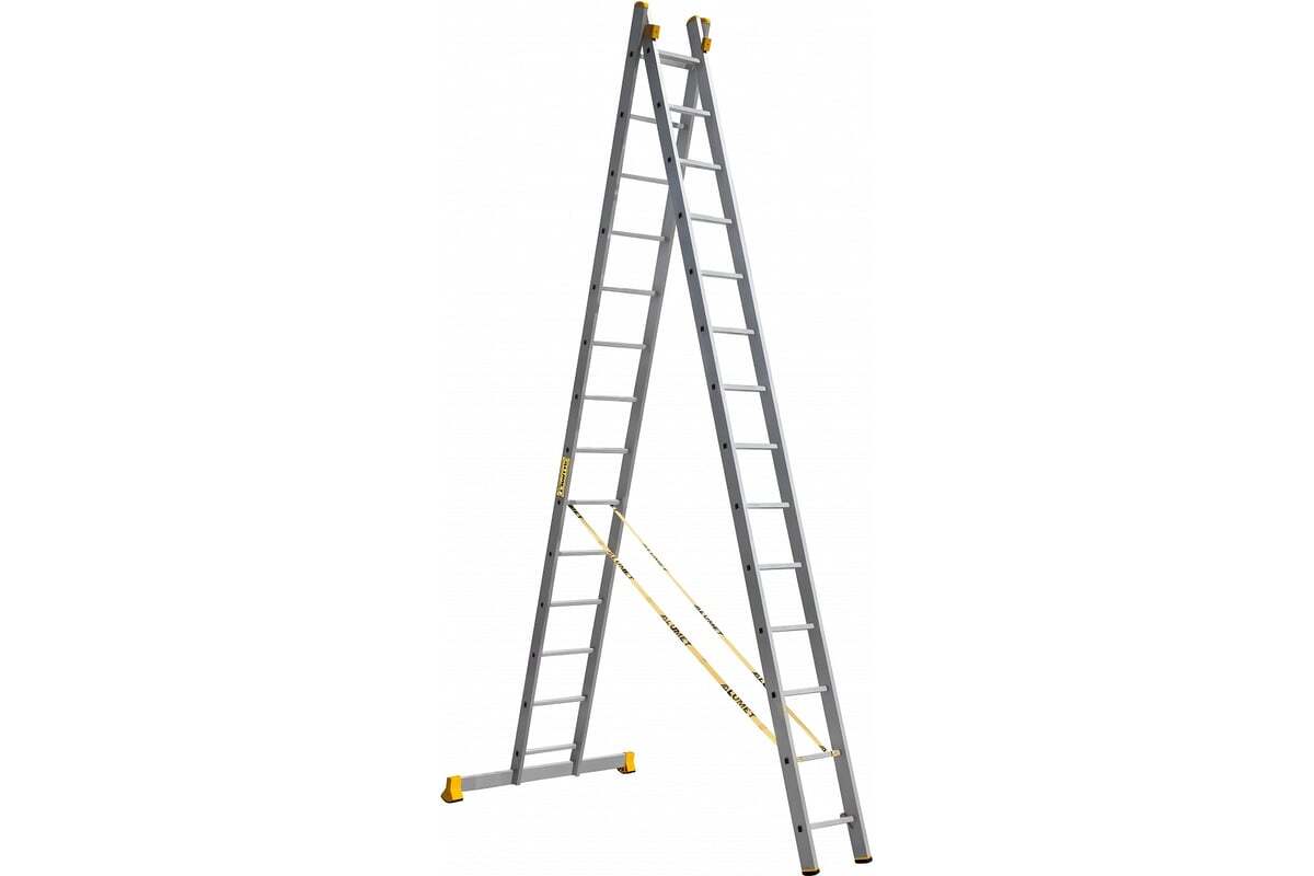 Лестница алюминиевая двухсекционная универсальная профессиональная серии P2 применяется при работе на высоте до 5м, при использовании в положении «Стремянка» и до 8м при использовании в положении «Приставная лестница». Прочность конструкции в приставном виде обеспечивается необходимым перехлестом секций, что делает ее конструктивно сложнее, тяжелее и поэтому дороже по сравнению с односекционной лестницей. От «расползания» лестницу в положении «двухсторонняя стремянка» удерживают страховочные ремни. Они же обеспечивают требуемый перехлест в положении «приставная лестница». Тетивы, ступени и стабилизатор лестницы изготовлены из высокопрочного алюминиевого сплава, в соответствии с требованиями ГОСТ 22233. На ступенях имеется рифление.