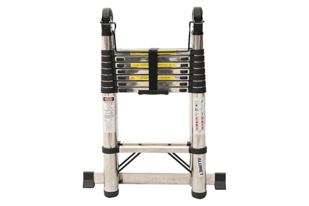 Лестница телескопическая двухсторонняя с шарниром представляет собой две лестницы, выдвигающиеся телескопическим методом на определенную высоту и соединенные стальными шарнирами. Каждая ступень (кроме первой) имеет с двух сторон фиксаторы. Шаг регулировки по высоте - 300 мм.