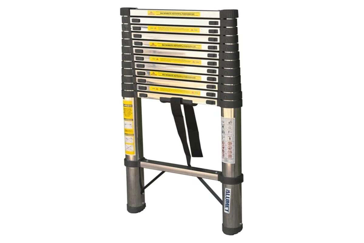 Лестница телескопическая Алюмет представляет собой лестницу, выдвигающуюся телескопическим методом на определенную высоту. Каждая ступень (кроме первой) имеет с двух сторон фиксаторы. Шаг регулировки по высоте - 300 мм. Лестница может использоваться только в положении «Приставная лестница».
