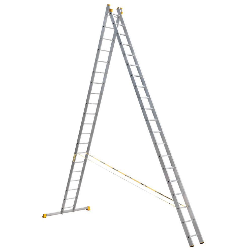 Лестница алюминиевая Алюмет двухсекционная 2х20 ступеней (9220) предназначена для строительно-монтажных работ. Изготовлена из высокопрочного алюминиевого сплава. Может использоваться как раздвижная приставная лестница и как свободностоящая двухсторонняя стремянка. Прочность конструкции в приставном виде обеспечивается необходимым перехлестом секций. От «расползания» лестницу в положении «двухсторонняя стремянка» удерживают страховочные ремни. Они же обеспечивают требуемый перехлест в положении «приставная лестница». Конструкция неразборная, поэтому отдельно пользоваться каждым из двух элементов лестницы невозможно. Широкий стабилизатор придает лестнице дополнительную устойчивость.