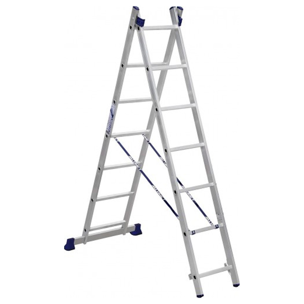 Лестница Алюмет 2* 7 алюминиевая предназначена для осуществления работ на высоте. Ее ножки надежно закрепляются на земле, что позволяет специалисту без опаски выполнять свои задачи. Легкая и прочная, такая лестница станет отличным приобретением для строительной бригады и простого домашнего мастера.