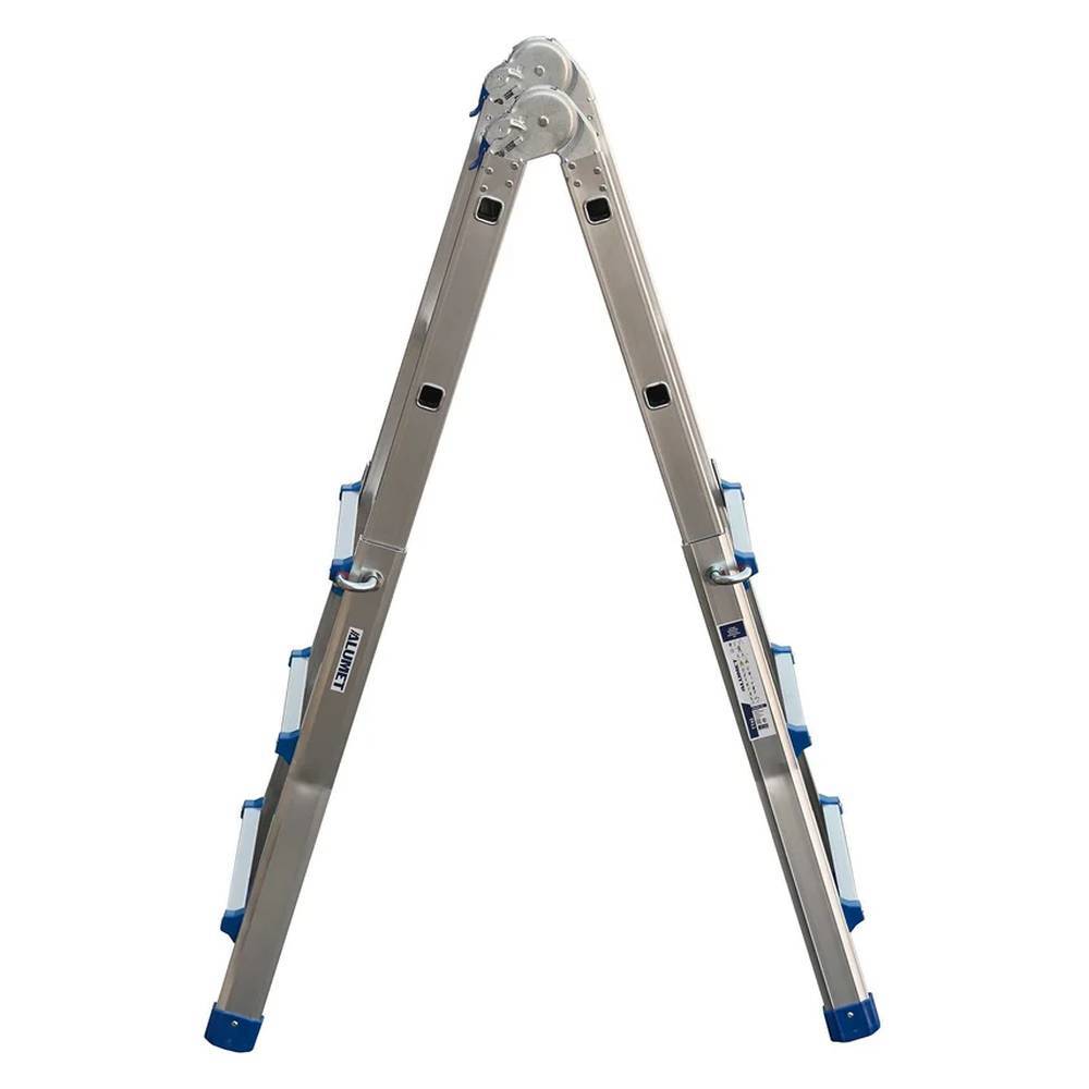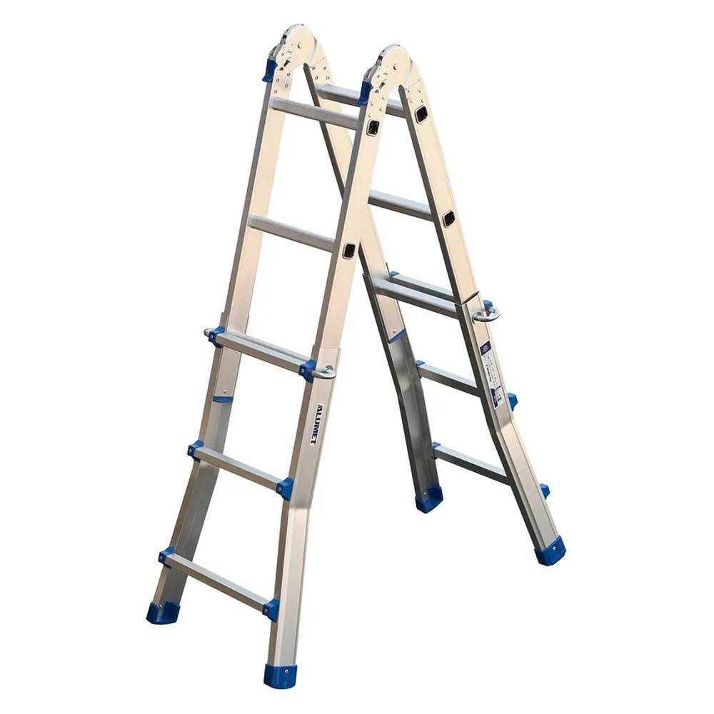 Лестница алюминиевая Алюмет телескопическая шарнирная 4x3 ступени (TT43) – представляет собой лестницу-трансформер, состоящую из двух основных и двух дополнительных секций, соединенных между собой стальными шарнирами. Дополнительные секции фиксируются к основным при помощи фиксатора, вставленного в ступень. Шарнины выполнены оцинкованной стали. Профиль лестницы изготовлен из высокопрочного алюминиевого сплава (ГОСТ 22233), обеспечивающего изделию прочность и легкость, что важно для транспортировки и установки. Профиль доп.секции - П-образный. Ступени выполнены с рифлением, что способствует безопасному подъёму и спуску. Идеальный помощник в офисе, на производстве, в быту, на даче. Лестницу можно использовать вне помещения. Конструкция стойкая к воздействию неблагоприятных погодных условий благодаря коррозионностойким свойствам алюминия. Этот фактор является одним из главных преимуществ модели.