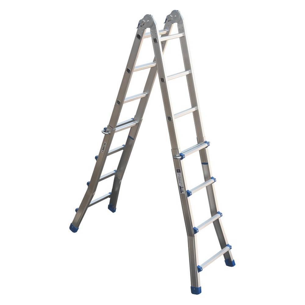 Лестница алюминиевая Алюмет телескопическая шарнирная 4x4 ступени (TT44) предназначена для проведения различных видов работ на высоте до 4.8м. Лестница состоит из 2-х основных и 2-х дополнительных секций. Основные секции соединены между собой стальными шарнирами. Дополнительные секции фиксируются к основным через фиксатор, вставленный в ступень. Может применяться в качестве приставной лестницы и двухсторонней стремянки. Также приспособлена к установке на лестничных маршах.