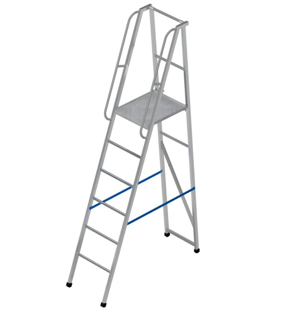 Лестница-платформа фиксированной высоты алюминиевая MEGAL ЛПФВА Н=2.0-2 с резиновыми башмаками предназначена для работ на небольшом возвышении, при проведении ремонтных, отделочных и иных работ. Лестница имеет безопасные ступени из специального рифленого профиля. Все соединительные узлы и элементы полностью безопасны, обработаны и одобрены службой контроля качества. Имеет легкий вес за счет использования алюминиевых сплавов. Противоскользящая поверхность площадки из рифленого алюминиевого листа «квинтет», поручни и ограждение высотой 1,1м обеспечивают безопасный подъем, спуск и проведение работ. Площадка размером 600х500мм позволяет удобно расположиться рабочему с необходимым инструментом. Резиновые башмаки в основании позволяют использовать лестницу внутри помещений. Складная конструкция позволяет удобно эксплуатировать, транспортировать и хранить лестницу.
