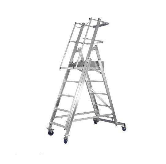 Лестница - платформа телескопическая MEGAL ТЛП (1,6 - 2,5) представляет собой безопасную и легкую конструкцию из алюминиевых профилей высокой прочности. Предназначена для работ в торговых залах, на складах, вдоль стеллажей и других объектов, при проведении ремонтных, монтажных и иных работ на возвышении. Лестница имеет легкий вес за счет использования алюминиевых сплавов. Лестница имеет регулируемый диапазон рабочих высот за счет изменения высоты рабочей площадки. Трехстороннее ограждение площадки со встроенной защитной планкой в районе колен, бортовое ограждение, ступени из рифленой трубы обеспечивают безопасный подъем, спуск и проведение работ. Заход на площадку имеет съемную цепочку. Площадка размером 680х510мм позволяет удобно расположиться рабочему с необходимым инструментом. Складная конструкция позволяет осуществлять простую и быструю сборку. Небольшая занимаемая площадь и прочные поворотные колеса со стопорами позволяют легко маневрировать в ограниченном пространстве.