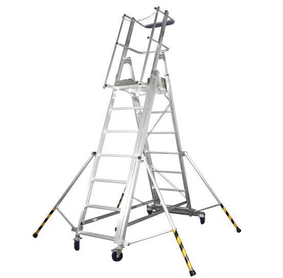 Лестница - платформа телескопическая MEGAL ТЛП (2,1 - 3,7) представляет собой безопасную и легкую конструкцию из алюминиевых профилей высокой прочности. Предназначена для работ в торговых залах, на складах, вдоль стеллажей и других объектов, при проведении ремонтных, монтажных и иных работ на возвышении. Лестница имеет легкий вес за счет использования алюминиевых сплавов. Лестница имеет регулируемый диапазон рабочих высот за счет изменения высоты рабочей площадки. Трехстороннее ограждение площадки со встроенной защитной планкой в районе колен, бортовое ограждение, ступени из рифленой трубы обеспечивают безопасный подъем, спуск и проведение работ. Заход на площадку имеет съемную цепочку. Площадка размером 680х510мм позволяет удобно расположиться рабочему с необходимым инструментом. Складная конструкция позволяет осуществлять простую и быструю сборку. Небольшая занимаемая площадь и прочные поворотные колеса со стопорами позволяют легко маневрировать в ограниченном пространстве.