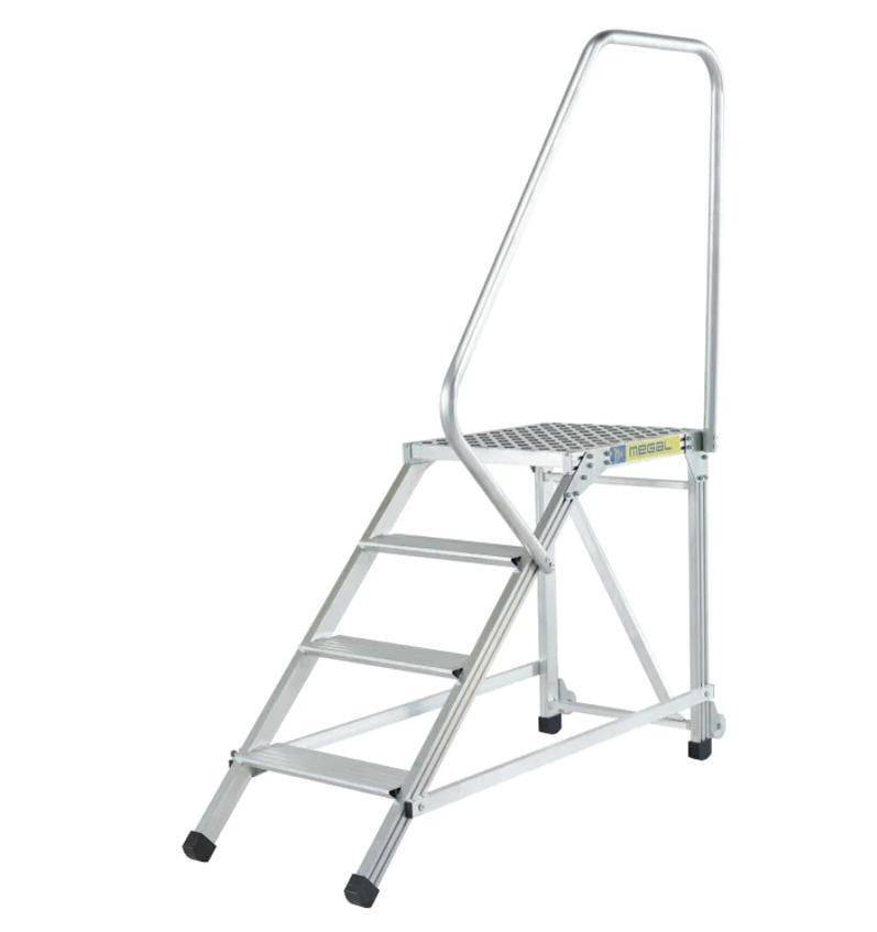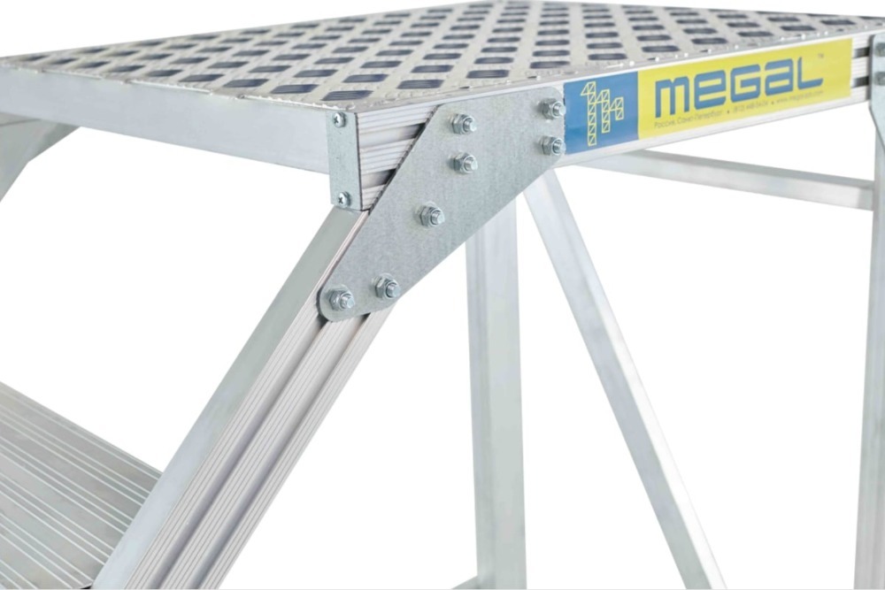 MEGAL ЛП-0,6 с одним поручнем используется при выполнении монтажных, сервисных и других работ на небольших высотах. Широкие ступени глубиной 160 мм из специального рифленого профиля для безопасности подъема и комфорта в работе. Верхняя площадка размером - 0,600х0,675 м. Наклонный лестничный марш под углом 45 градусов. Высокая грузоподъемность обеспечивается за счет использования труб и профилей со стенкой не менее 2,5мм. Сверху лестница укомплектована поручнем, снизу – резиновыми противоскользящими башмаками и комплектом колес.