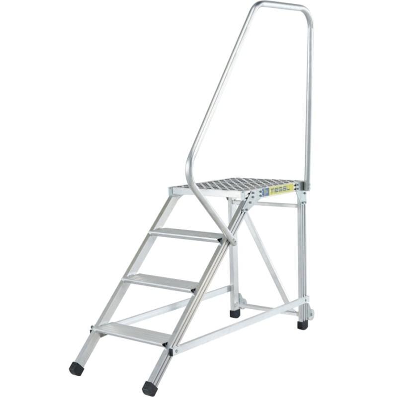 Лестница подмости MEGAL ЛП-0,8 с одним поручнем используется при выполнении монтажных, сервисных и других работ на небольших высотах. Широкие ступени глубиной 160 мм из специального рифленого профиля для безопасности подъема и комфорта в работе. Верхняя площадка размером - 0,600х0,675 м. Наклонный лестничный марш под углом 45 градусов. Высокая грузоподъемность обеспечивается за счет использования труб и профилей со стенкой не менее 2,5мм. Сверху лестница укомплектована поручнем, снизу – резиновыми противоскользящими башмаками и комплектом колес.