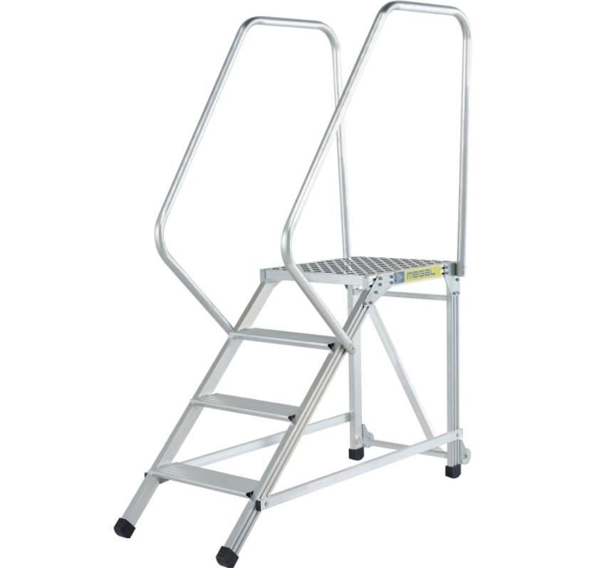 Лестница подмости MEGAL ЛП-1,0 с двумя поручнями используется при выполнении монтажных, сервисных и других работ на небольших высотах. Широкие ступени глубиной 160 мм из специального рифленого профиля для безопасности подъема и комфорта в работе. Верхняя площадка размером - 0,600х0,675 м. Наклонный лестничный марш под углом 45 градусов. Для удобства подъема подмости оснащены двумя поручнями. Высокая грузоподъемность обеспечивается за счет использования труб и профилей со стенкой не менее 2,5мм. Ножки подмостей имеют резиновые противоскользящие башмаки. Для удобства перемещения подмости оснащены колесами.