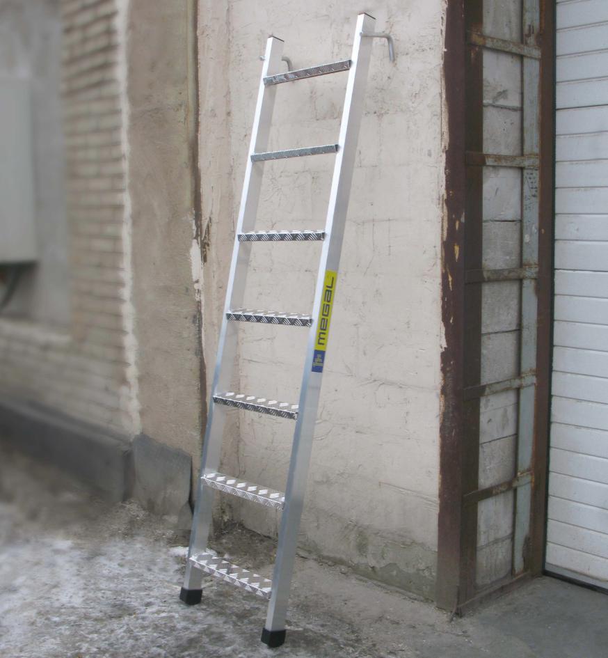 Лестница приставная стеллажная MEGAL ЛПС - 4,5 используется для безопасного доступа на стеллажные системы различной высоты. На верхних концах тетив имеется 2 крюка для навешивания используемой лестницы на трубу (профиль). Снизу лестница оснащена резиновыми противоскользящими башмаками. Удобные ступени из рифленого листа квинтет обеспечивают комфортный подъем и спуск. Соединения ступеней и тетивы, выполненные посредством аргонно-дуговой сварки, увеличивают надежность и долговечность лестницы.