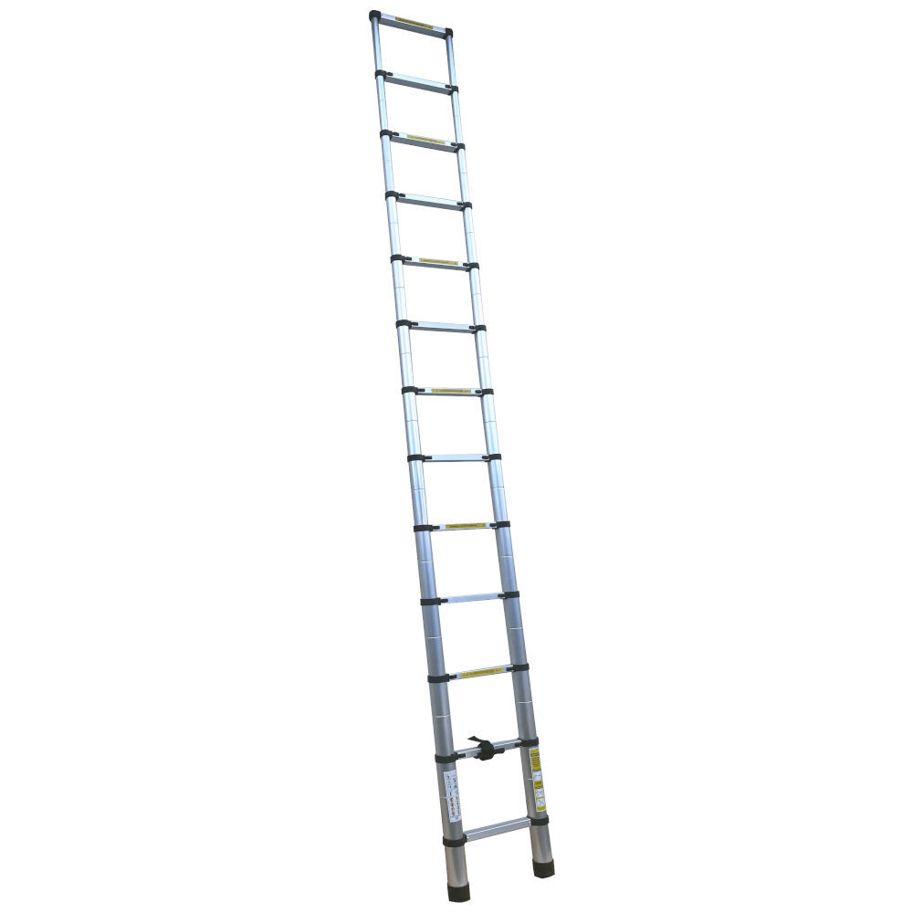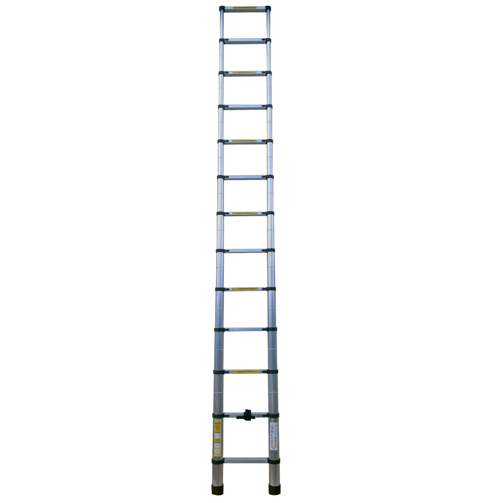 Лестница телескопическая Алюмет односекционная 13 ступеней (TLS 3.8) представляет собой лестницу, выдвигающуюся телескопическим методом на определенную высоту. Каждая ступень (кроме первой) имеет с двух сторон фиксаторы. Шаг регулировки по высоте – 300мм. Телескопическая лестница удобна в хранении и транспортировке. Ступени в сложенном состояние фиксируются ремнем.