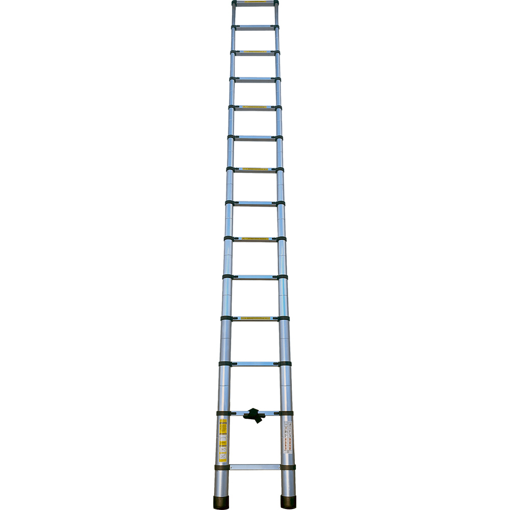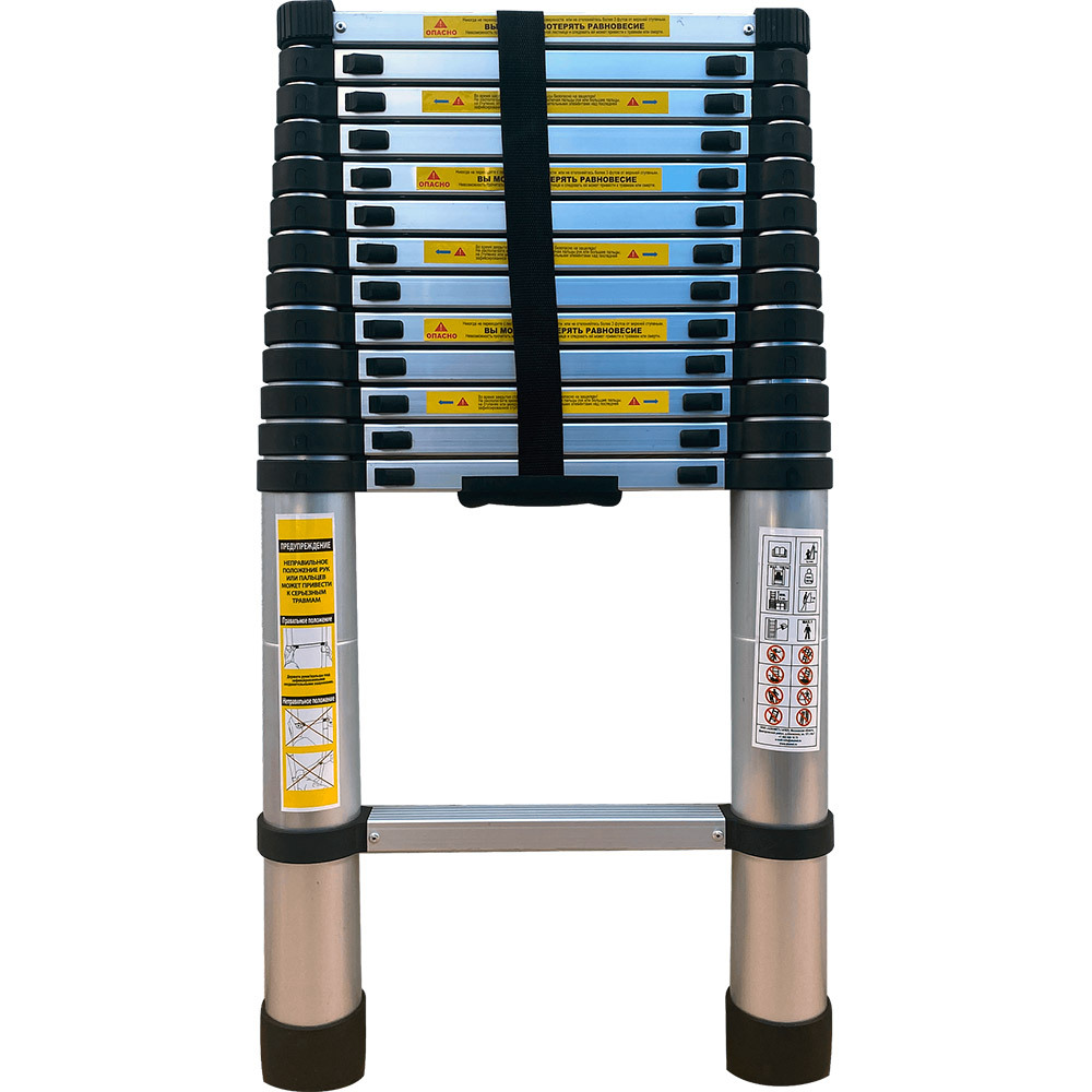 Лестница телескопическая Алюмет односекционная 14 ступеней (TLS 4.1) предназначена для проведения различных видов работ на высоте до 5м. Представляет собой лестницу, выдвигающуюся телескопическим методом на определенную высоту. Каждая ступень (кроме первой) имеет с двух сторон фиксаторы. Шаг регулировки по высоте – 300мм. Ступени в сложенном состояние фиксируются ремнем. Профиль изготовлен из алюминиевого сплавав. Ступени имеют противоскользящую рельефную поверхность. На концах секции пластиковые колпаки-антипроскальзователи.