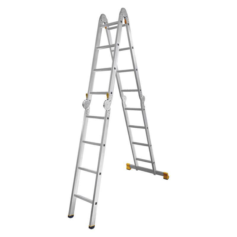 Лестница-трансформер алюминиевая Алюмет 4x4 ступеней (T4144L) отличается от аналогов небольшим весом и удобной конструкцией. Она состоит из четырех секций и способна принимать разные положения. Такую лестницу можно использовать как в качестве стремянки, так и в обычном виде. Ширина ступенек 33см позволяет работать в ограниченном пространстве. Стальные шарниры, алюминиевый профиль и стабилизатор шириной 70см придают конструкции устойчивость. В сложенном состоянии изделие можно перевозить в багажнике легкового автомобиля.