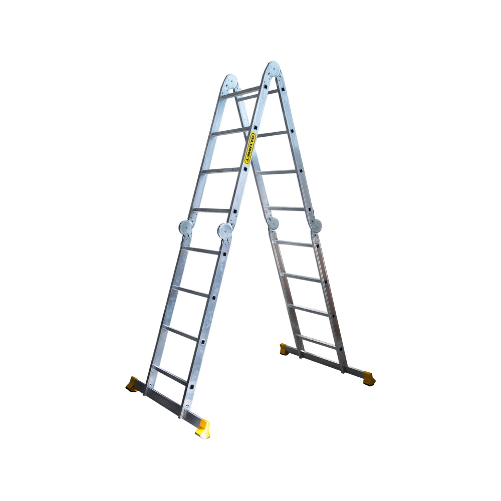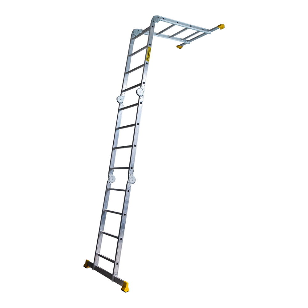 Алюминиевая лестница-трансформер АлюметTW1 444 предназначена для работы на высоте от 3,37 м до 5,77 м. Шарнирная лестница состоит из 4 секций с 4 ступенями. Ширина ступеней 50 см позволяет легко спускаться и подниматься с инструментом или другим оборудованием.