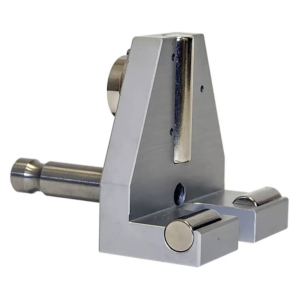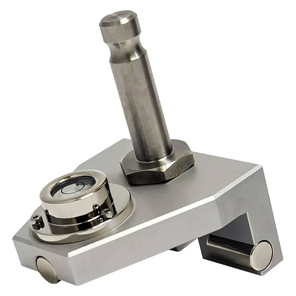 Корпус крепления RGK 103-GW-L изготовлен из алюминиевого сплава в виде L-образного профиля методом фрезерования. Для удобства выполнения разметки или для точной установки изделия над выбранной поперечной меткой на рельсе в боковой части предусмотрена соответствующая прорезь. Для фиксации устройства на стальных и чугунных поверхностях используются три неодимовых магнита цилиндрической формы, запрессованные в корпус, которые обладают высокой прочностью и обеспечивают надежность сцепления. Положение оси стального адаптера под фитинг для геодезического оборудования формата Leica совпадает с боковой поверхностью головки рельса, что исключает необходимость пересчета получаемых показаний. Для выравнивания отражателя на верхней плоскости адаптера размещен круглый пузырьковый уровень, поддерживающий возможность юстировки.