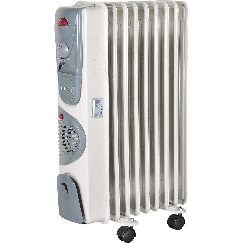 Масляный радиатор Eurolux ОМ-EU-9НВ мощностью 2400 Вт с 9 секциями, вентилятором и термозащитой быстро нагреет воздух в помещении площадью до 30 кв. м. Герметичный металлический корпус устройства полностью заполнен маслом, которое при включении прибора нагревается ТЭНом. Низкая теплопроводность масляного наполнения позволяет корпусу дольше сохранять оптимальную температуру, поэтому радиатор работает не постоянно, а периодически выключается и включается по мере необходимости. Модель работает в нескольких режимах: при мощности 800, 1200 и 2000 Вт. При этом с помощью регулятора можно выбрать температуру нагрева. Особенностью модели ОМ-EU-9НВ является наличие вентилятора. Его можно использовать для вентилирования воздуха, выбрав холодный режим, или для более быстрого прогрева помещения, выбрав режим теплой вентиляции. Масляный радиатор защищен от перегрева, работает бесшумно. Корпус имеет надежное лакокрасочное покрытие, установлен на раму с колесами для более легкого передвижения, оснащен кронштейном для наматывания кабеля. Удобная, бесшумная, простая в управлении модель Eurolux ОМ-EU-9НВ пригодится в жилом и любом служебном помещении, поможет создать комфортные температурные условия и будет поддерживать заданную температуру в течение необходимого времени без лишних трат электроэнергии.
