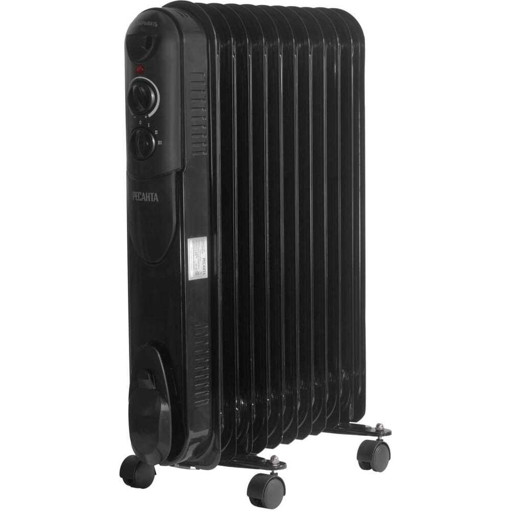 Мощный, надёжный, безопасный масляный радиатор чёрного цвета модели Ресанта ОМПТ-12НЧ предназначен для обогрева помещений площадью до 30 м². Он состоит за 11-ти металлических секций. Внутри прибора залито минеральное масло, нагреваемое ТЭНом, который расположен в нижней части корпуса. Конструкция позволяет быстро выходить на режим нагрева, равномерно распределять тепло и при этом не пересушивать воздух в помещении. Мощность масляного нагревателя составляет 2.5 кВт с возможностью выбора одного из трёх режимов нагрева: 1 – 1000 Вт, 2 – 1500 Вт и 3 – 2500 Вт. Работа агрегата контролируется регулируемым термостатом. Присутствует также система термозащиты, которая предназначена для отключения обогревателя в случае перегревов. Для удобной переноски прибора он оснащён ручкой. В конструкции имеется встроенный отсек для хранения шнура питания. Шнур длинный, что позволяет устанавливать масляный обогреватель в любом удобном месте. Модель обогревателя Ресанта ОМПТ-12НЧ питается от обычной бытовой элестросетисети – 220 В, 50 Гц. Вес агрегата – 8.3 кг.