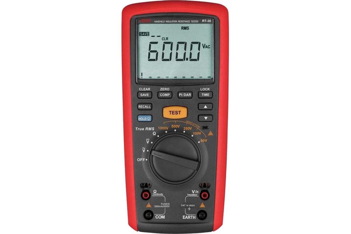 Цифровой мегаомметр RGK RT-30 с поверкой - прибор для электротехников и специалистов по ремонту, который используется для быстрой оценки состояния изоляции силовых кабелей. Чаще всего устройство применяется для техобслуживания промышленного оборудования (электродвигателей, трансформаторов) и сетей, в сервисных центрах по ремонту электроники и при работе с электрическими системами обогрева пола.
