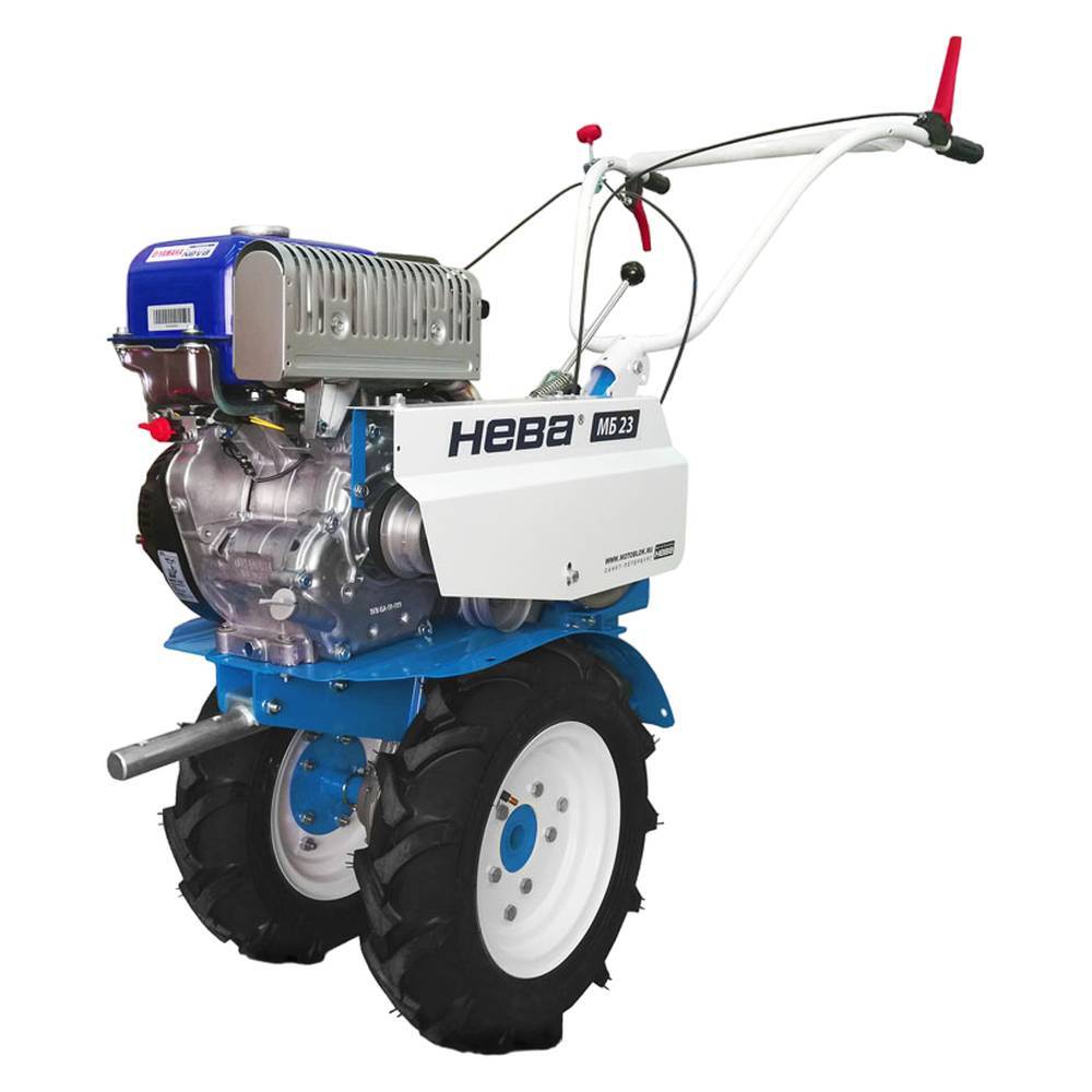 Мотоблок Нева МБ-23 (МХ300) PRO с четырёхтактным двигателем МХ300, объём которого 296 кубических сантиметров, мощность 12 л.с. или 8,8 кВт. Агрегат имеет повышенные тяговые возможности и расширенный набор передач: 4 передних скорости и 2 задние. Рычаг переключения передач для удобства оператора размещён на руле. Руль можно регулировать по высоте и углу поворота. Ёмкость масляного бака 1,5 литра, топливный бак вмещает 5,5 литра. Функция разобщения колес позволяет развернуть мотоблок практически на месте. Диаметр колёс 4 дюйма. Культивирует все виды почв, культивация осуществляется 4 – 8 фрезами. Ширина культивации до 170 см. Вес мотоблока 95 кг. Зимой, с помощью навесного оборудования мотоблок можно использовать для уборки снега. Агрегат способен выполнять широкий перечень задач, в том числе применяется для транспортировки грузов и передвижения оператора.