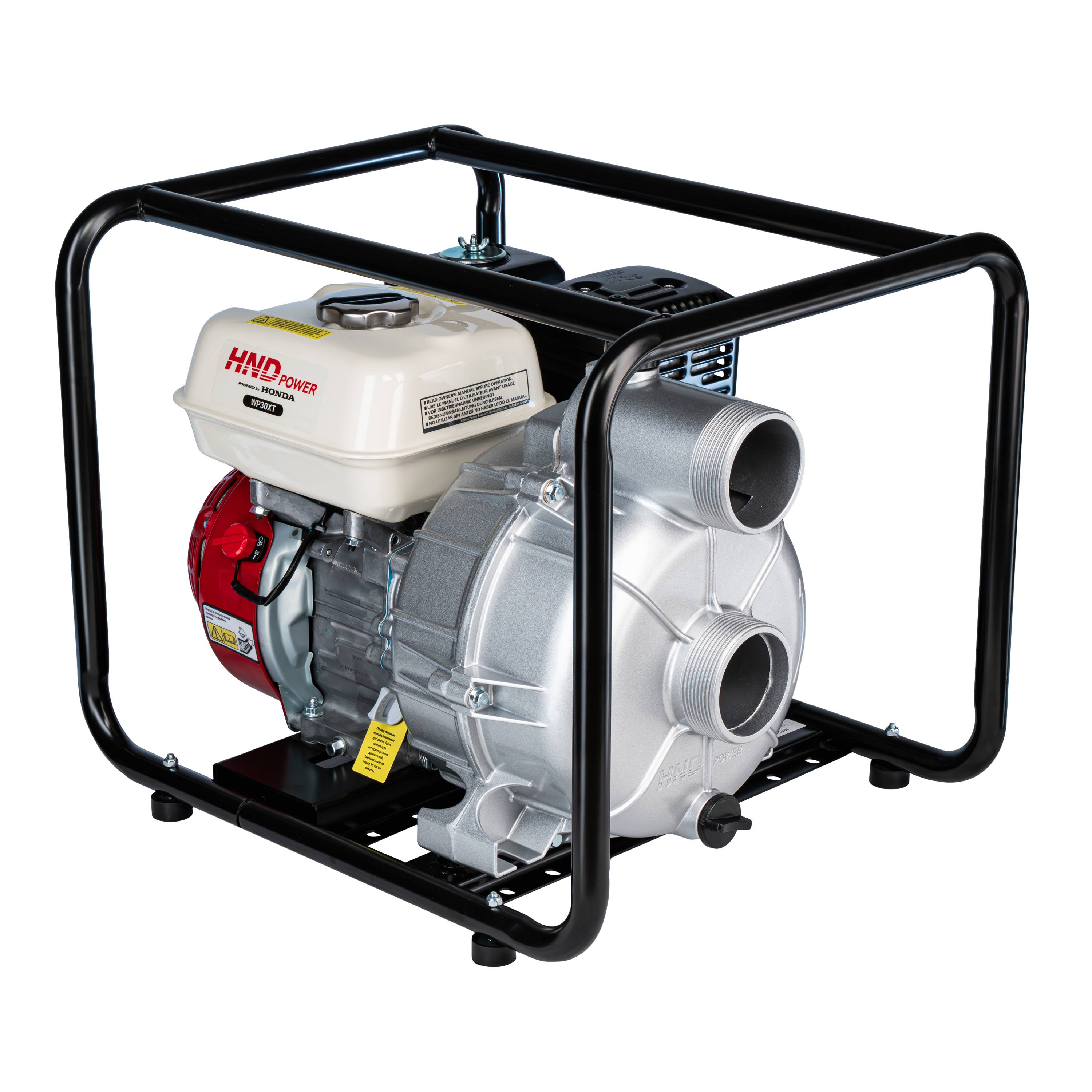 Мотопомпа бензиновая HND WP 30 XT предназначена для перекачки сильно загрязненной воды (максимальный размер частиц до 28 мм.), подойдет для выполнения грязных работ и перекачки засоренной воды, содержащей большое количество мусора (песок, ил, ветки, гравий, другие взвешенные в воде фрагменты). WP30XT поднимает воду с глубины до 5 метров и подает ее на высоту до 20 метров, может активно применяться в строительстве для осушения котлованов, подвалов, кабельных траншей, в сфере ЖКХ, для полива или для эвакуации отходов. Мотопомпа оснащена высокопроизводительным 4-тактным одноцилиндровым OHV-двигателем Honda GX200 рабочим объемом 196 см3, позволяющим добиться максимальной производительности в 1000 л/мин. Габариты мотопомпы WP30XT составляют 552 x 432 x 442 мм, а вес 35 кг.