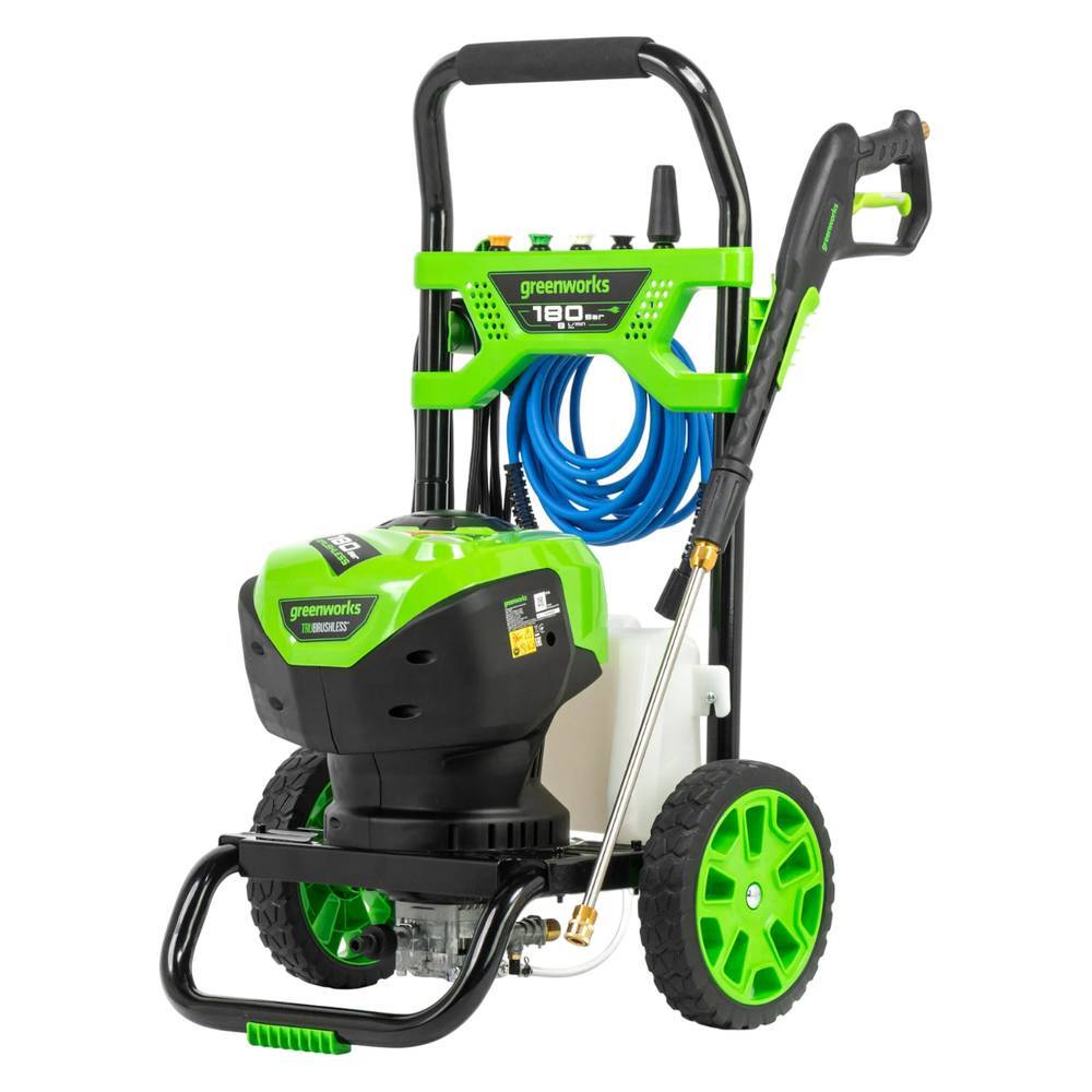 Мойка высокого давления Greenworks GDPW-Semi-P15 применяется для мойки авто/мото техники, придомовых территорий, дорожек, площадок, садового инвентаря и т.д. Мощный двигатель 1800 Вт и надежная алюминиевая помпа с поршнем из нержавеющей стали обеспечивают максимальное давление 180 бар и производительность 480л/час. Все принадлежности для качественной мойки входят в комплект: усиленный профессиональный пистолет, с металлической трубкой - удлинителем, 4 насадки с различными углами распыления. Шланг высокого давления длиной 7,6м, что позволяет свободно перемещаться при мытье крупных объектов. Мойка смонтирована на прочной раме и оснащена большими колесами для удобства перемещения. Пистолет, а также шланг высокого давления и электрический кабель крепятся на ручке рамы и всегда будут под рукой.