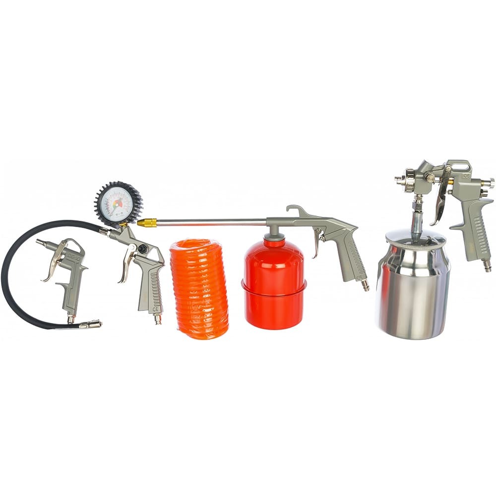 Набор к компрессору Concorde SGKB1.5Q (н/б) представляет собой коллекцию пневматических инструментов. Подойдет для автомастерских и небольших предприятий. В него входят: краскораспылитель с нижним бачком SGB1,5Q; пистолет для подкачки шин с манометром TG35Q; пистолет моющий с регулируемым соплом WG1000Q; пистолет продувочный BG30Q и шланг спиральный SHQ6-5.